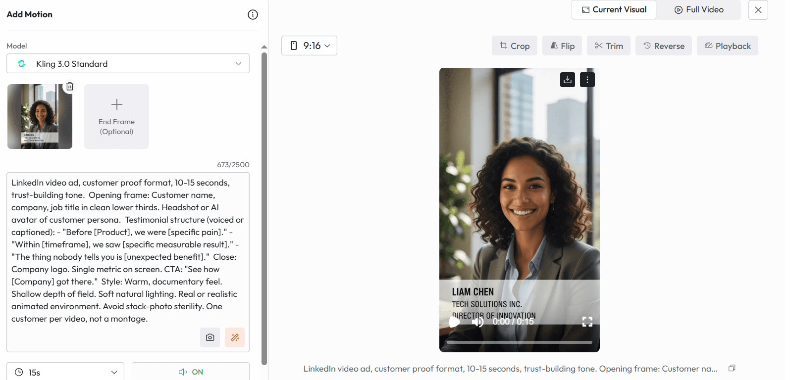 LinkedIn video ad, customer proof format, 10-15 seconds, trust-building tone. Opening frame: Customer name, company, job title in clean lower thirds. Headshot or AI avatar of customer persona. Testimonial structure (voiced or captioned): - "Before [Product], we were [specific pain]." - "Within [timeframe], we saw [specific measurable result]." - "The thing nobody tells you is [unexpected benefit]." Close: Company logo. Single metric on screen. CTA: "See how [Company] got there." Style: Warm, documentary feel. Shallow depth of field. Soft natural lighting. Real or realistic animated environment. Avoid stock-photo sterility. One customer per video, not a montage.