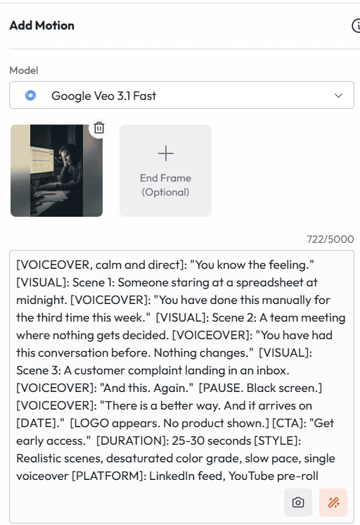 [VOICEOVER, calm and direct]: "You know the feeling." [VISUAL]: Scene 1: Someone staring at a spreadsheet at midnight. [VOICEOVER]: "You have done this manually for the third time this week." [VISUAL]: Scene 2: A team meeting where nothing gets decided. [VOICEOVER]: "You have had this conversation before. Nothing changes." [VISUAL]: Scene 3: A customer complaint landing in an inbox. [VOICEOVER]: "And this. Again." [PAUSE. Black screen.] [VOICEOVER]: "There is a better way. And it arrives on [DATE]." [LOGO appears. No product shown.] [CTA]: "Get early access." [DURATION]: 25-30 seconds [STYLE]: Realistic scenes, desaturated color grade, slow pace, single voiceover [PLATFORM]: LinkedIn feed, YouTube pre-roll