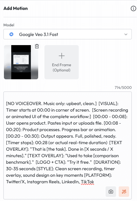 [NO VOICEOVER. Music only: upbeat, clean.] [VISUAL]: Timer starts at 00:00 in corner of screen. [Screen recording or animated UI of the complete workflow:] [00:00 - 00:08]: User opens product. Pastes input or uploads file. [00:08 - 00:20]: Product processes. Progress bar or animation. [00:20 - 00:30]: Output appears. Full, polished, ready. [Timer stops]: 00:28 (or actual real-time duration) [TEXT OVERLAY]: "That is [the task]. Done in [X seconds / X minutes]." [TEXT OVERLAY]: "Used to take [comparison benchmark]." [LOGO + CTA]: "Try it free." [DURATION]: 30-35 seconds [STYLE]: Clean screen recording, timer overlay, sound design on key moments [PLATFORM]: Twitter/X, Instagram Reels, LinkedIn, TikTok