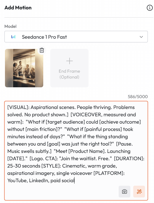 [VISUAL]: Aspirational scenes. People thriving. Problems solved. No product shown.] [VOICEOVER, measured and warm]: "What if [target audience] could [achieve outcome] without [main friction]?" "What if [painful process] took minutes instead of days?" "What if the thing standing between you and [goal] was just the right tool?" [Pause. Music swells subtly.] "Meet [Product Name]. Launching [DATE]." [Logo. CTA]: "Join the waitlist. Free." [DURATION]: 25-30 seconds [STYLE]: Cinematic, warm grade, aspirational imagery, single voiceover [PLATFORM]: YouTube, LinkedIn, paid social