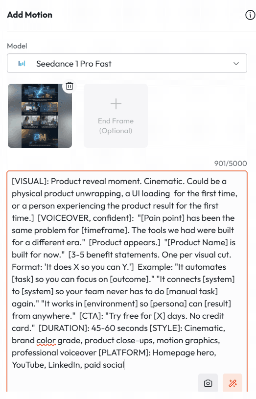 [VISUAL]: Product reveal moment. Cinematic. Could be a physical product unwrapping, a UI loading for the first time, or a person experiencing the product result for the first time.] [VOICEOVER, confident]: "[Pain point] has been the same problem for [timeframe]. The tools we had were built for a different era." [Product appears.] "[Product Name] is built for now." [3-5 benefit statements. One per visual cut. Format: 'It does X so you can Y.'] Example: "It automates [task] so you can focus on [outcome]." "It connects [system] to [system] so your team never has to do [manual task] again." "It works in [environment] so [persona] can [result] from anywhere." [CTA]: "Try free for [X] days. No credit card." [DURATION]: 45-60 seconds [STYLE]: Cinematic, brand color grade, product close-ups, motion graphics, professional voiceover [PLATFORM]: Homepage hero, YouTube, LinkedIn, paid social