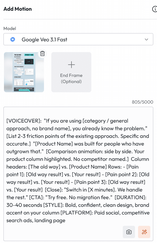 [VOICEOVER]: "If you are using [category / general approach, no brand name], you already know the problem." [List 2-3 friction points of the existing approach. Specific and accurate.] "[Product Name] was built for people who have outgrown that." [Comparison animation: side by side. Your product column highlighted. No competitor named.] Column headers: [The old way] vs. [Product Name] Rows: - [Pain point 1]: [Old way result] vs. [Your result] - [Pain point 2]: [Old way result] vs. [Your result] - [Pain point 3]: [Old way result] vs. [Your result] [Close]: "Switch in [X minutes]. We handle the rest." [CTA]: "Try free. No migration fee." [DURATION]: 30-40 seconds [STYLE]: Bold, confident, clean design, brand accent on your column [PLATFORM]: Paid social, competitive search ads, landing page