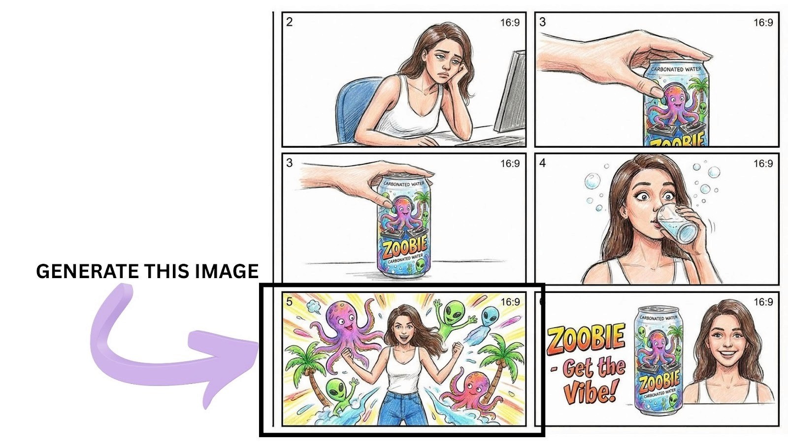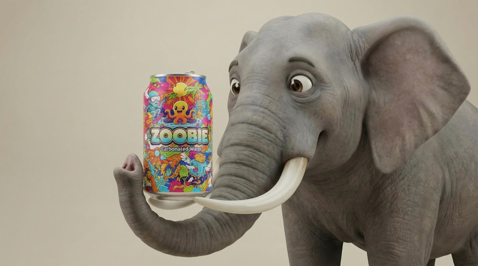 Result: The model keeps the brand name (e.g., "ZOOBIE") perfectly intact while generating a photorealistic background.