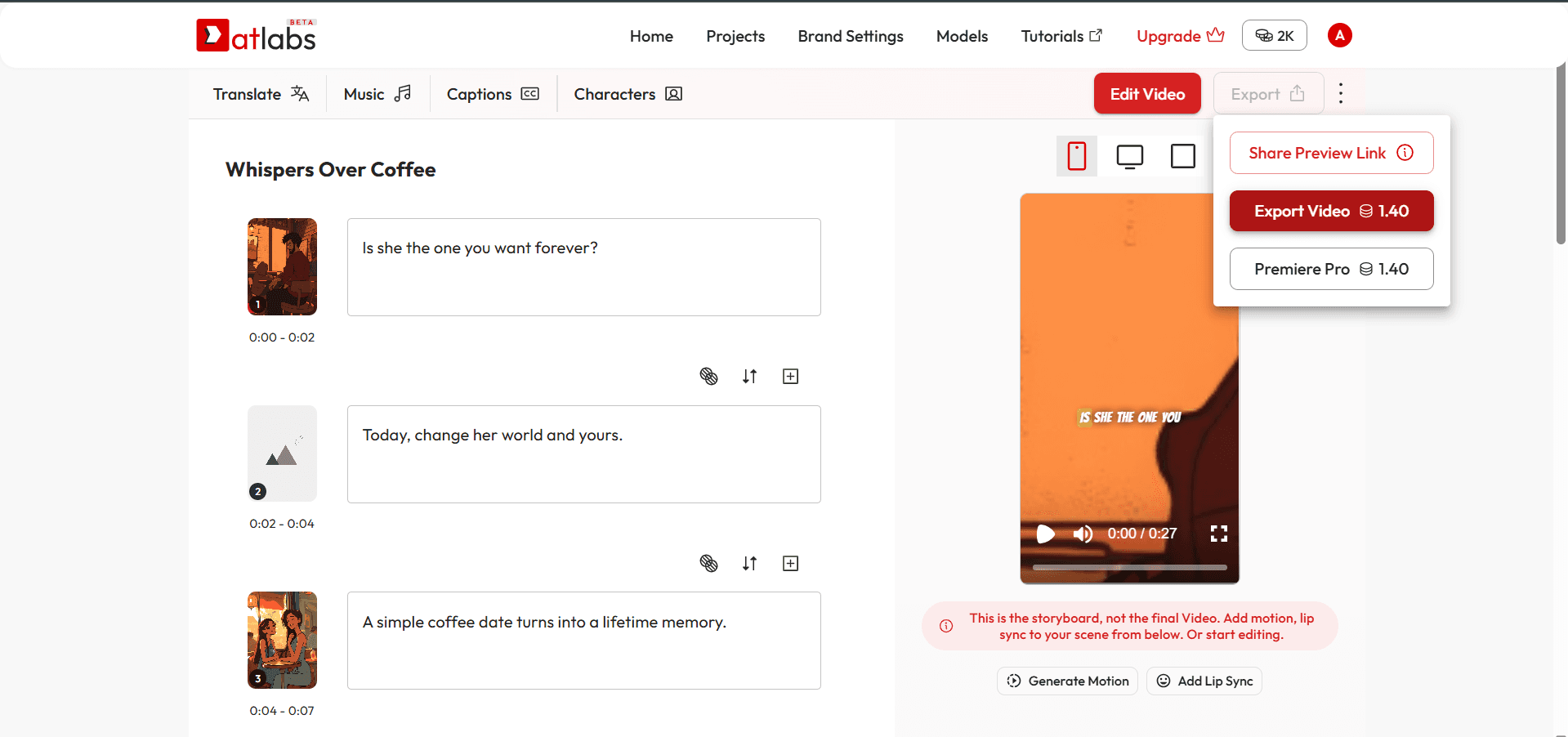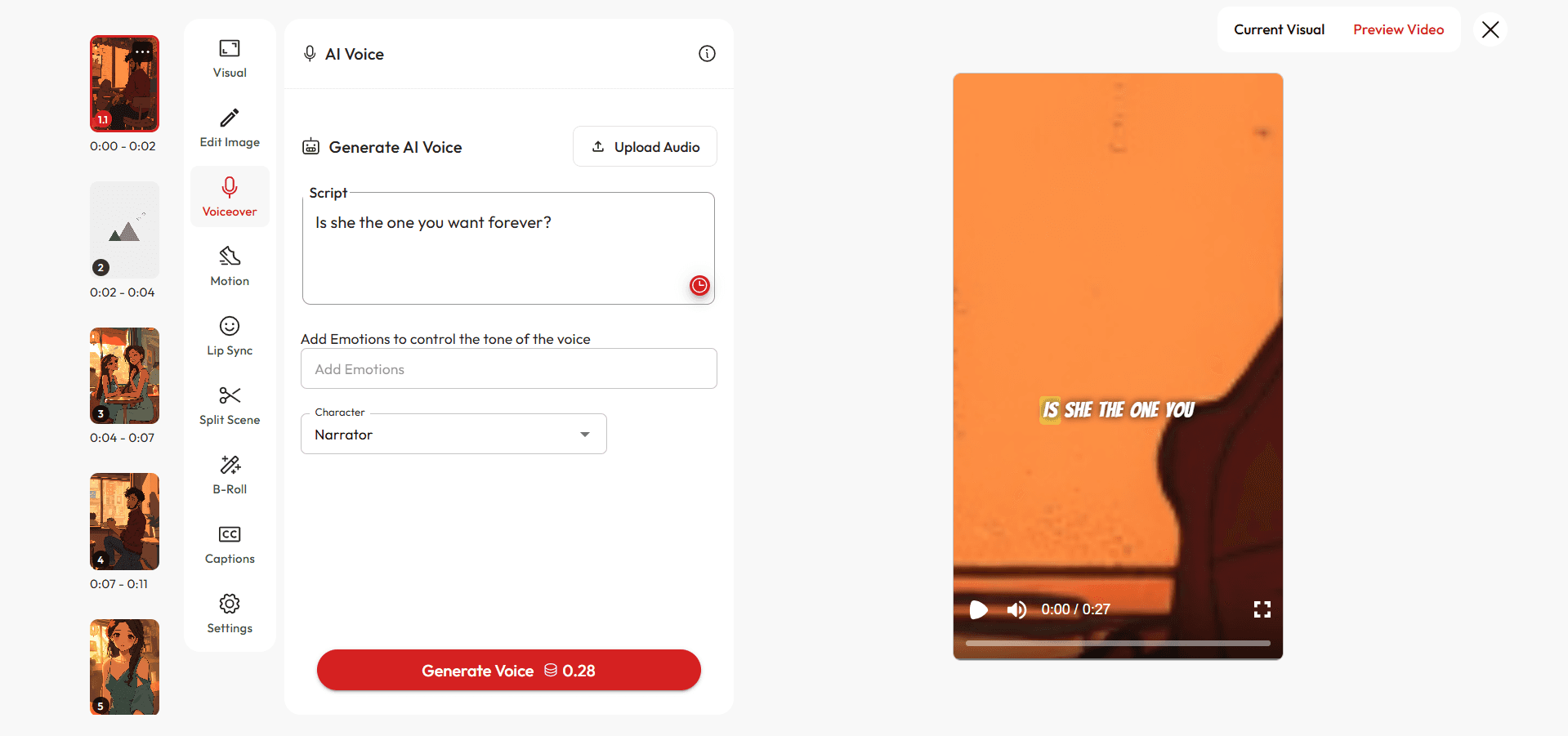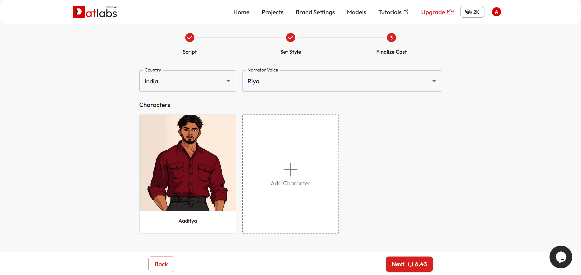 Atlabs breaks your script into logical scenes and allows you to choose a variety of AI-generated voices for each character and scene