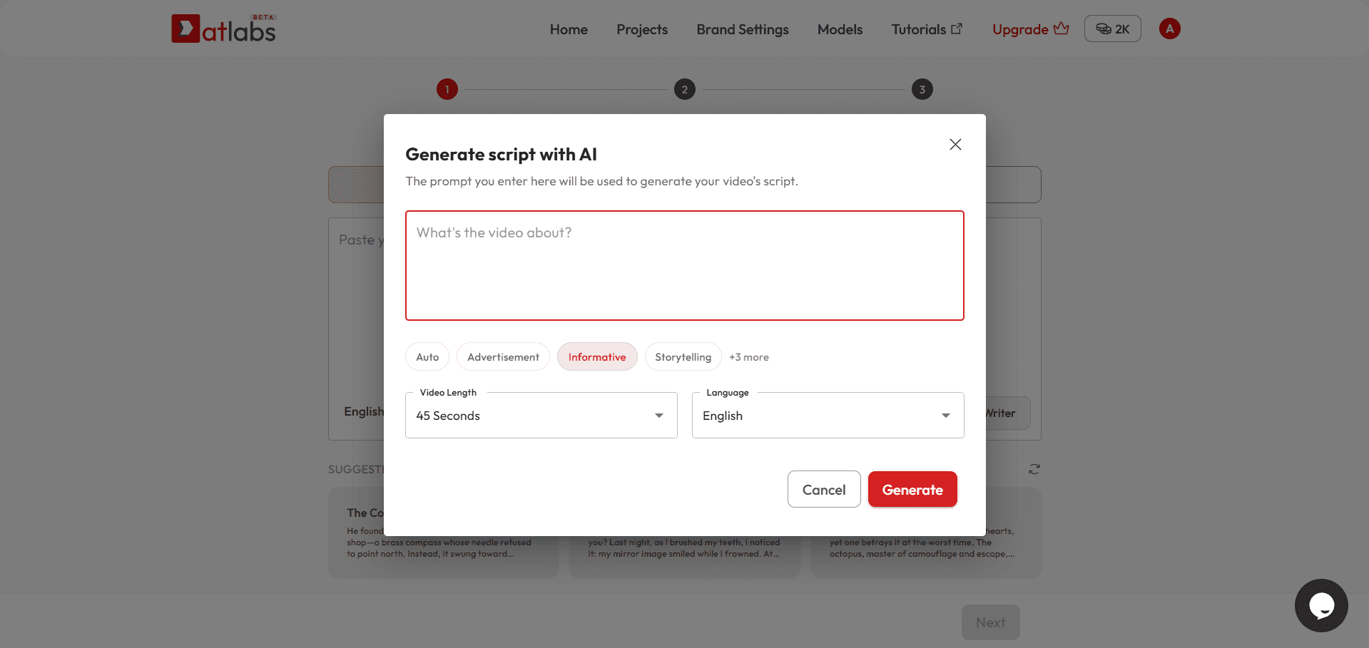 Enter your own script/screenplay or let the AI Script Writer generate one from a prompt.