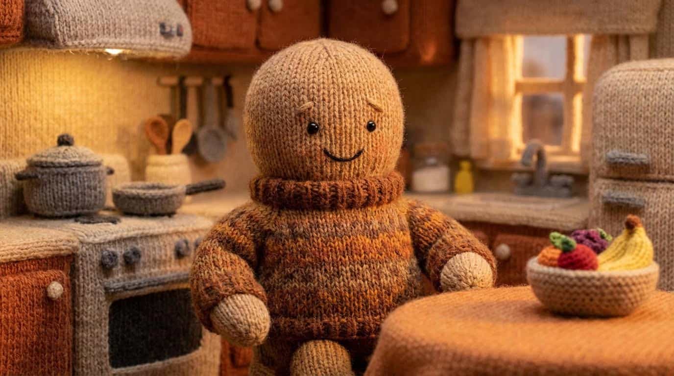 Dad Octopus stirring a pot on the stove with one tentacle. Steam rises from pot. Other tentacles relaxed at sides. Gentle swaying movement only. Knitted wool texture maintained throughout. Warm kitchen lighting.