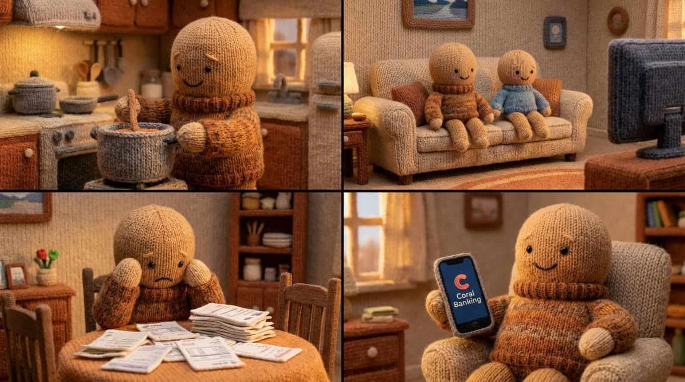 The Concept: A "knitted," handcrafted visual style. A Dad Octopus gets his tentacles "tied up" by bills and subscriptions, only to be untangled by Coral Banking.