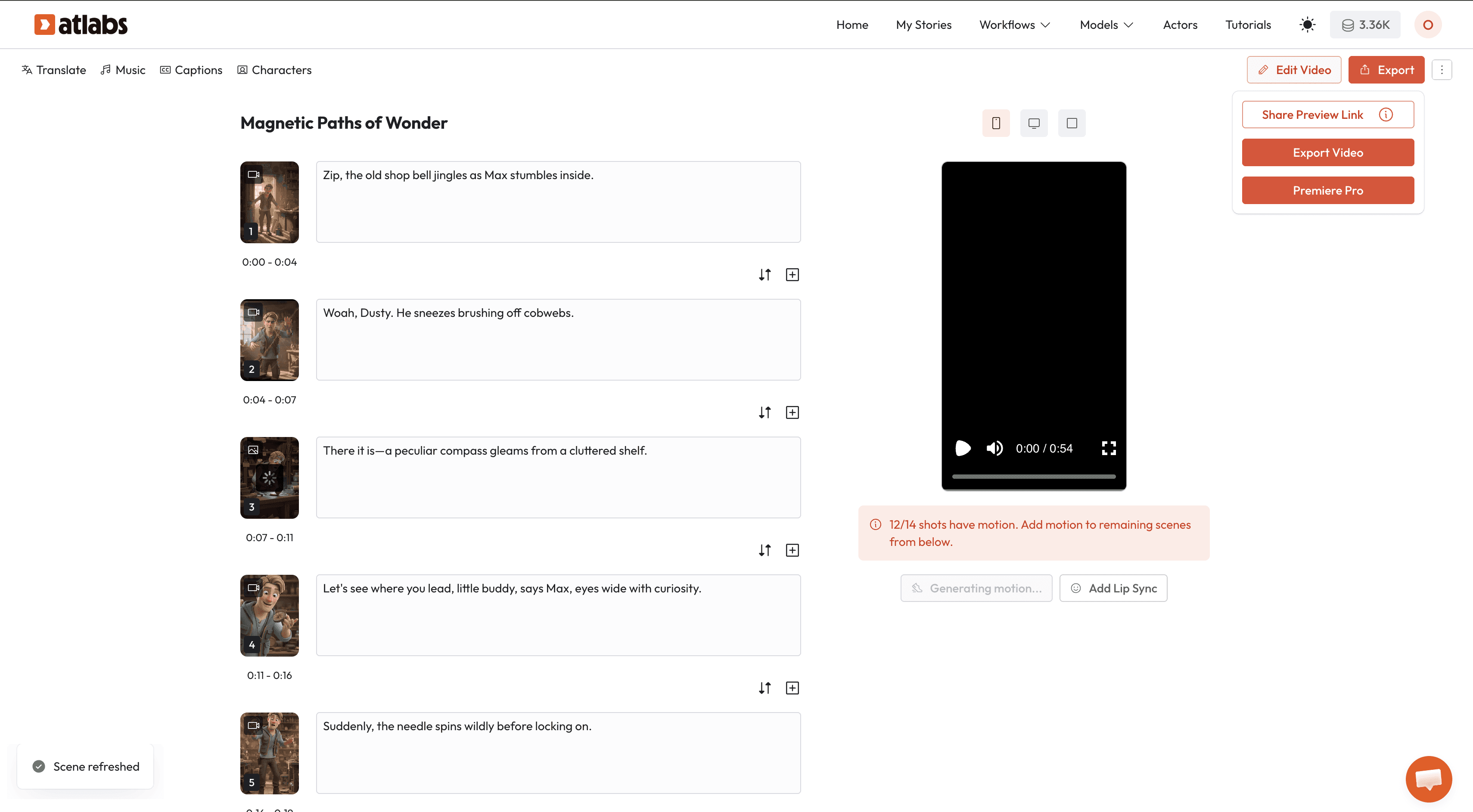 While the auto-generated result is often great, Atlabs offers a robust Edit Section to fine-tune specific scenes.
