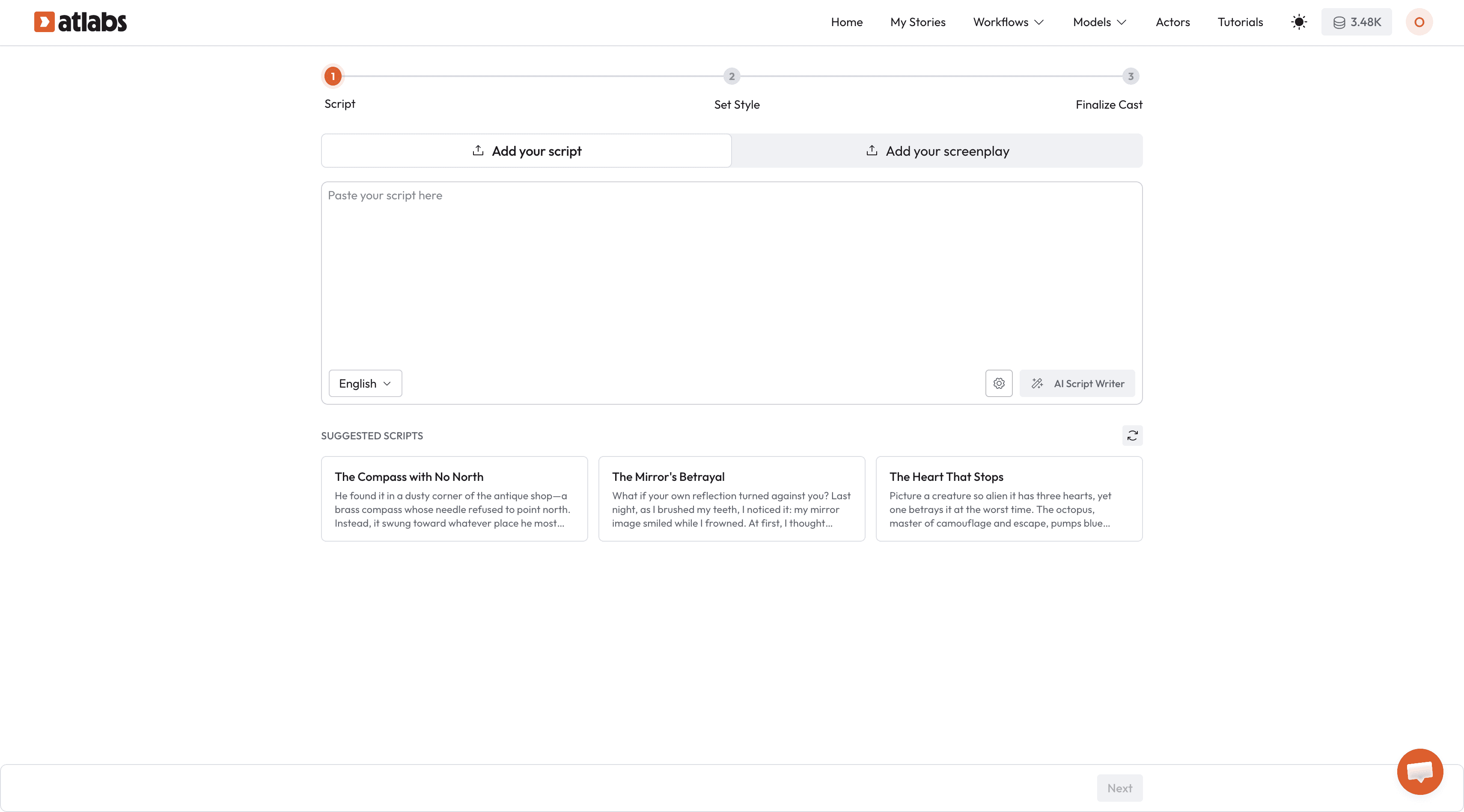 Use AI Writer: If you don’t have a script, click the "AI Script Writer" button. Enter a prompt (e.g., "A story about a girl and a cat finding a secret garden"), and the AI will generate the scenes for you.