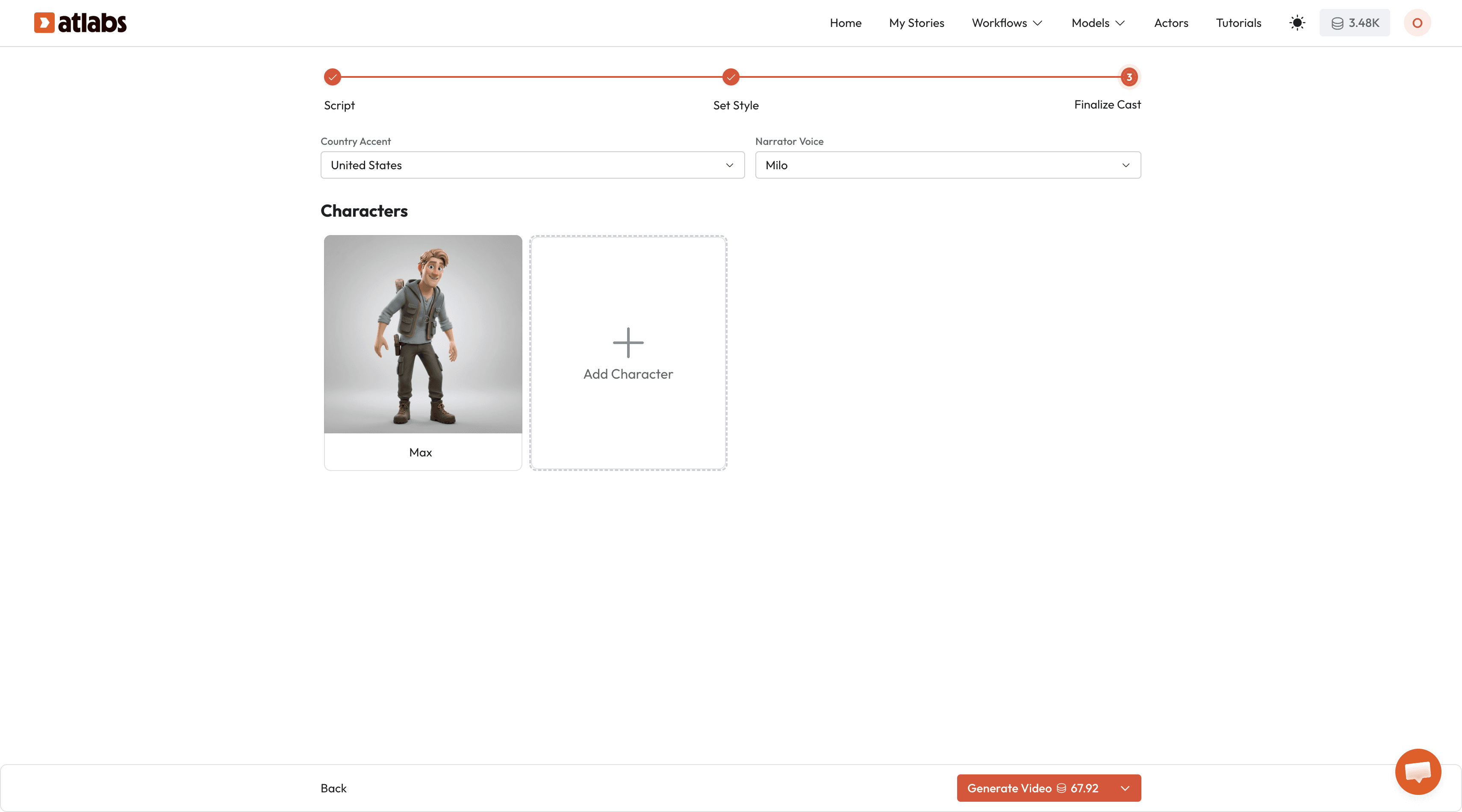 Atlabs automatically extracts characters from your script. This is where you ensure character consistency.