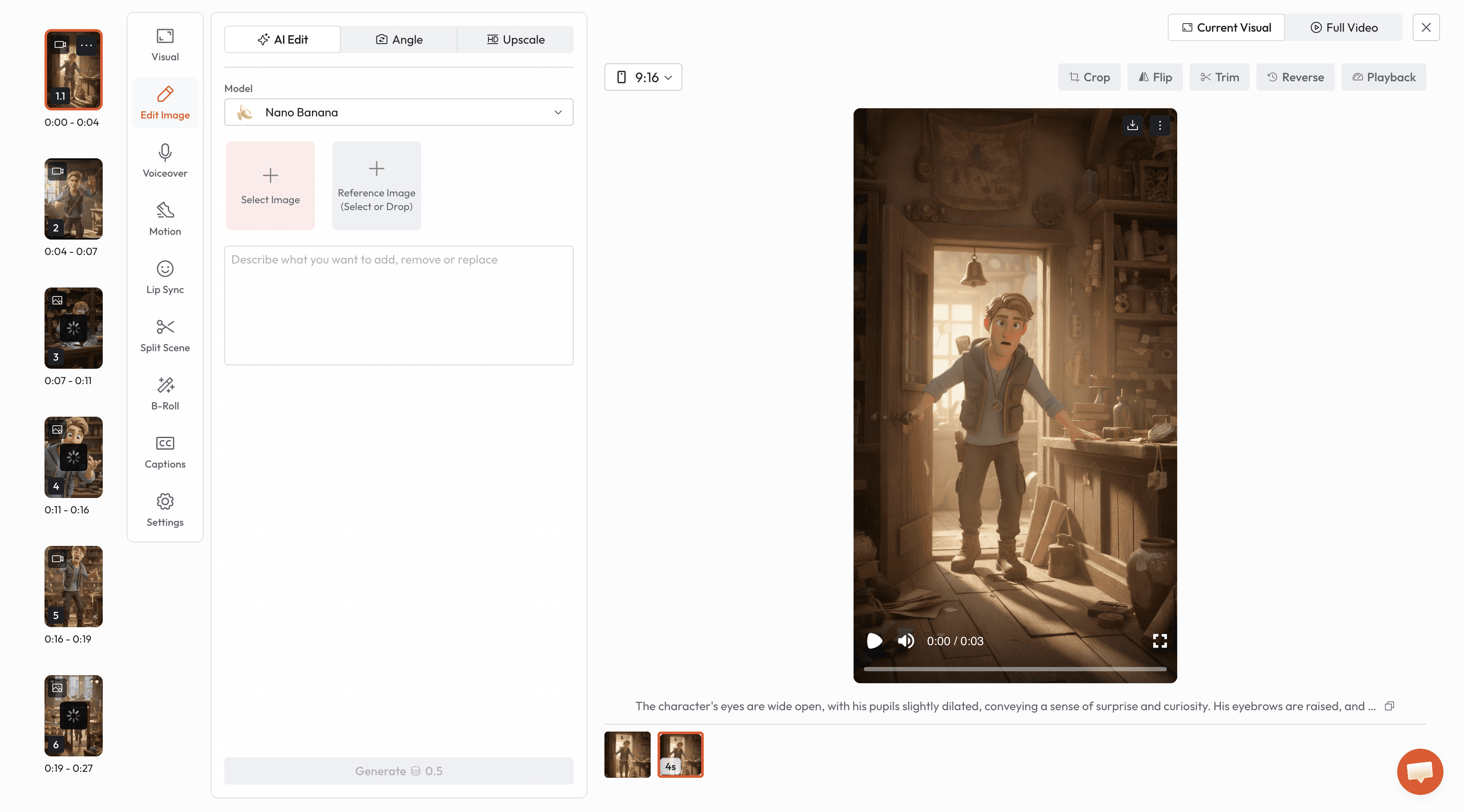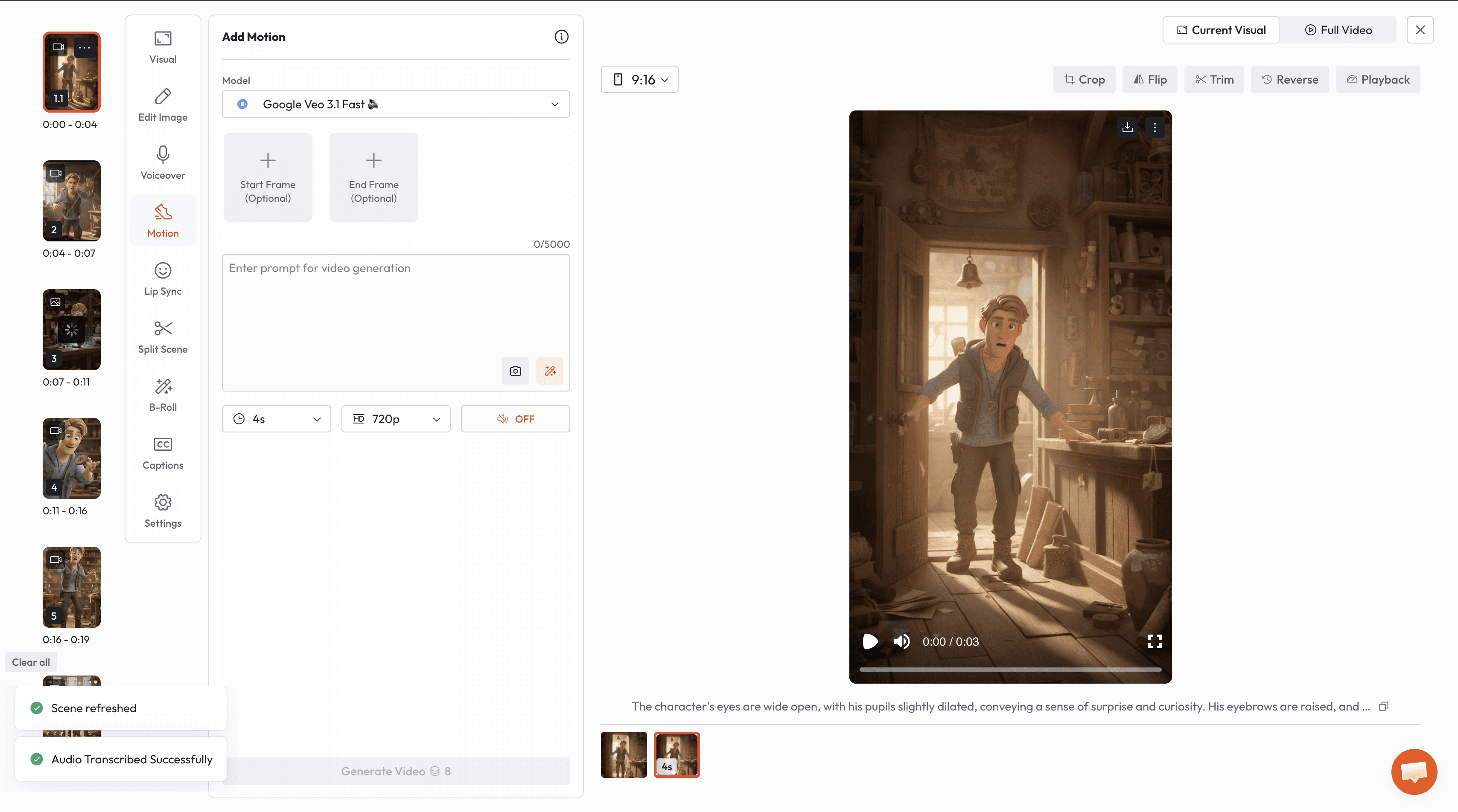 Regenerate Images: If a specific frame looks wrong, click the scene and hit Regenerate. You can tweak the prompt to change specific details.