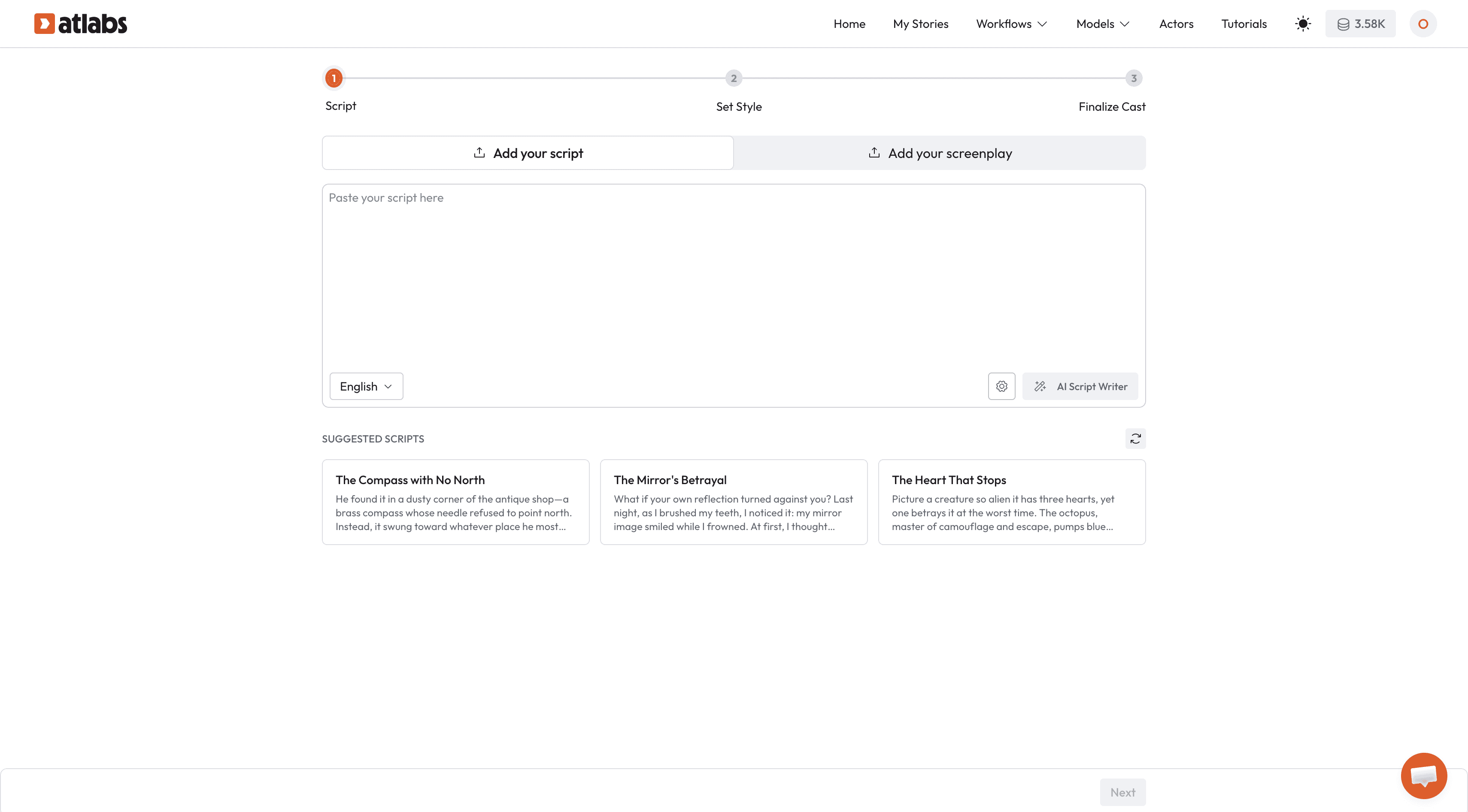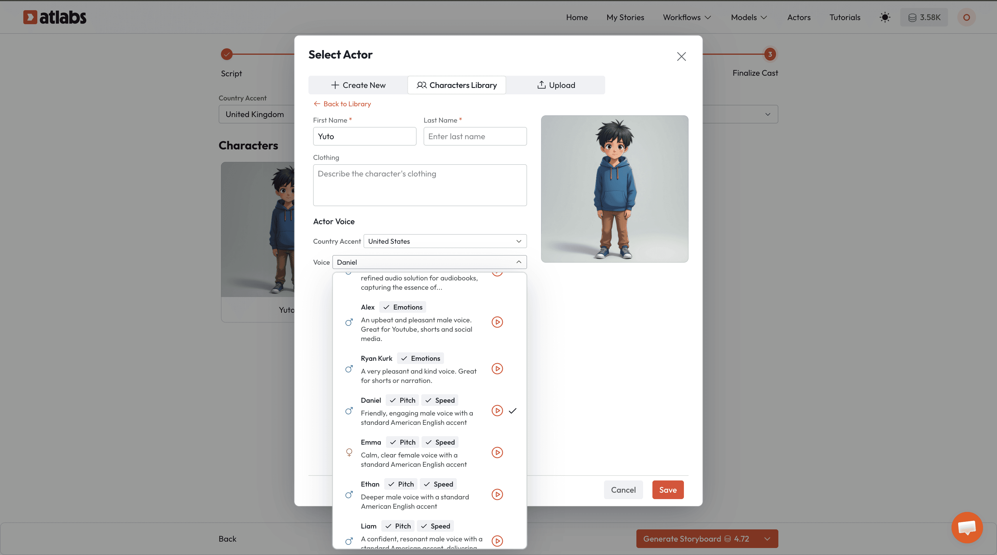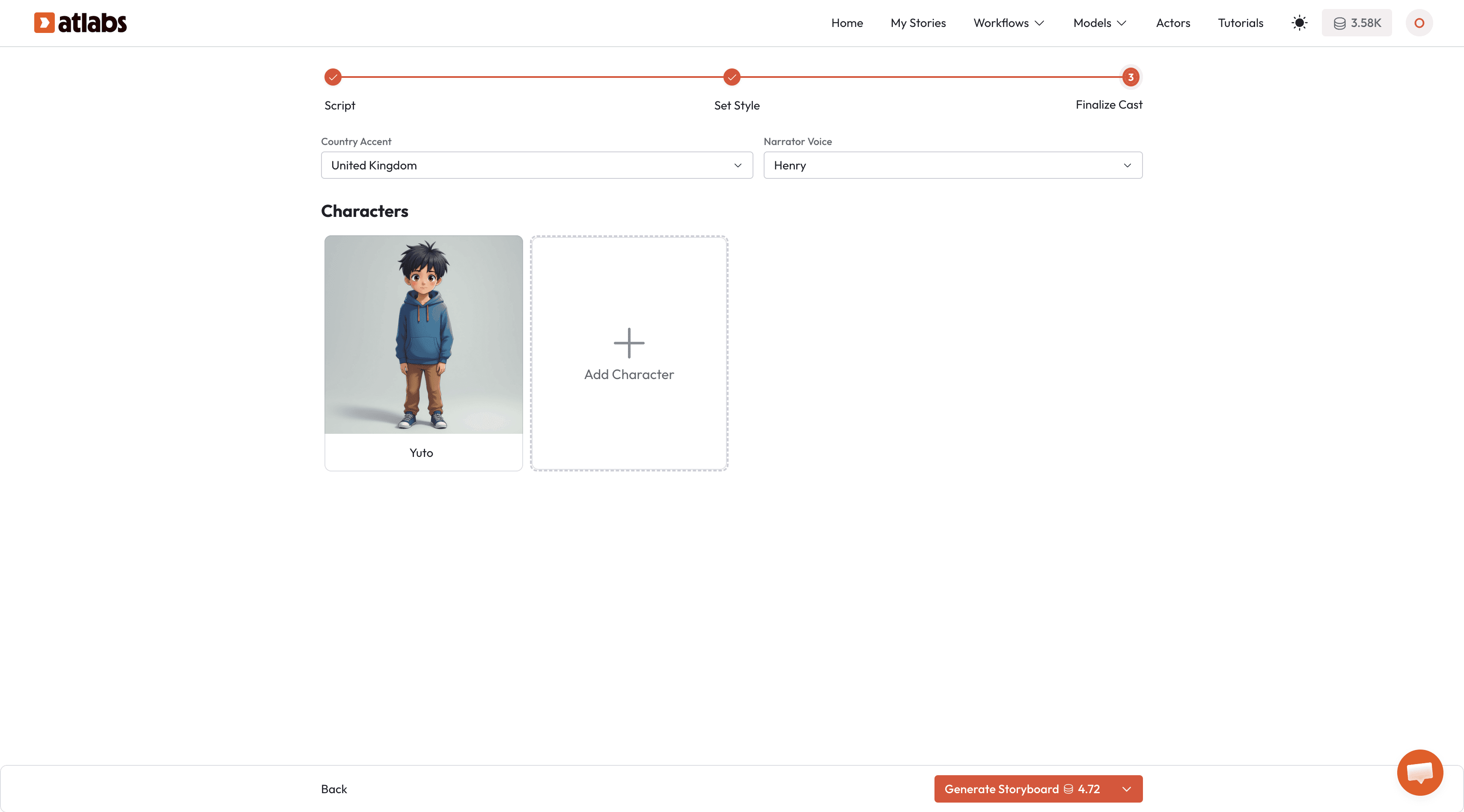 Atlabs solves this automatically: Upload your character references once, and they're saved in your library with perfect visual consistency across unlimited episodes. No redrawing, no variation the exact same character every time.