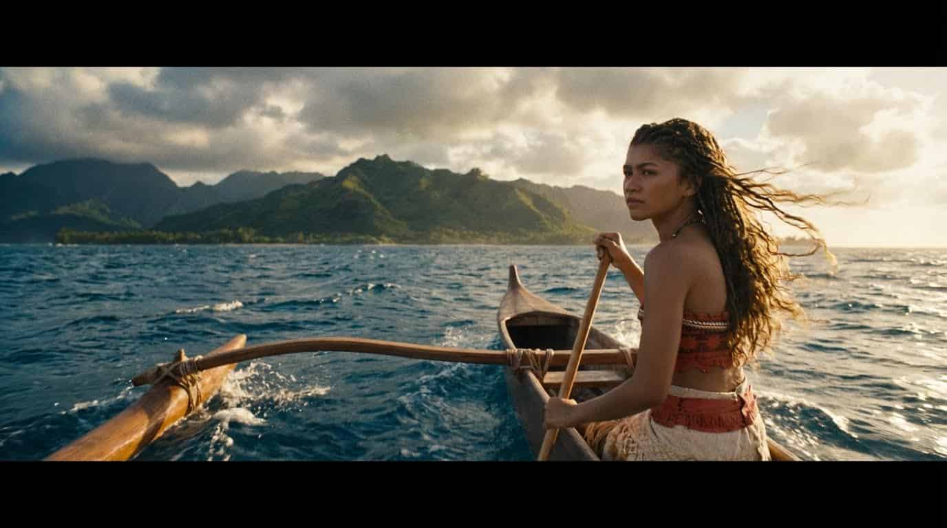 Slow dolly camera move in. Zendaya looks out into the distance. She keeps her head still as her hair gently moves in the wind. Subtle smile on her face. Cinematic lighting.