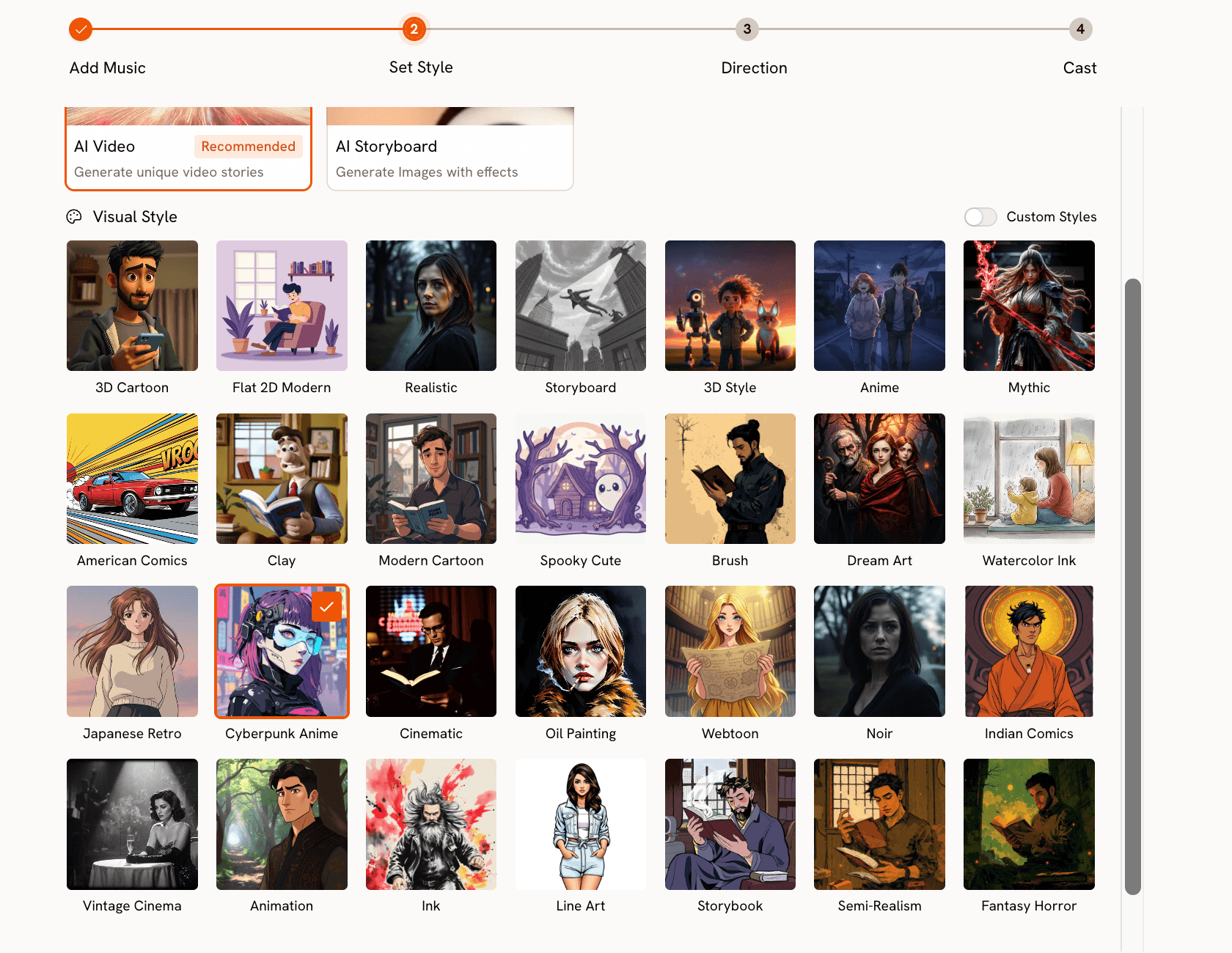 Match your visual style to the mood you set in Step 1 and the production feel of your Suno track. A Cyberpunk Anime style on a slow ballad will create a mismatch that weakens both.