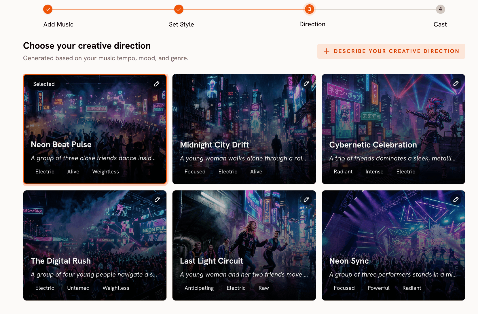 Atlabs generates six scene concepts automatically based on your track's detected tempo, mood, and genre. Each concept has a title, a written description, and mood tags. For a K-Pop track with Euphoric mood and Fast Tempo, the generated concepts will reflect K-Pop's visual conventions: performance-forward staging, expressive lighting, character-centric framing. Read all six before deciding — the range between them is often significant.