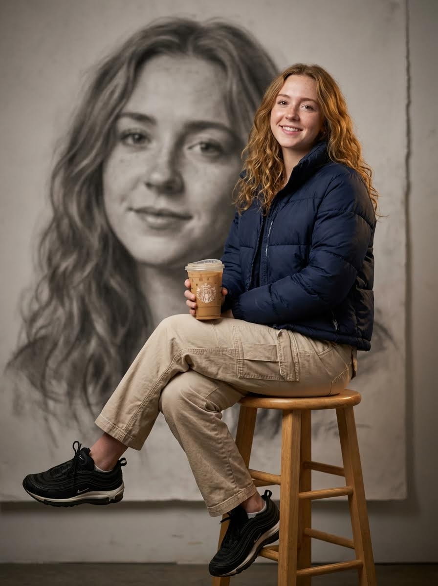 Use the uploaded reference image to create subject sitting gracefully on a stool, wearing navy blue puffer jacket, beige cargo pants, and black Nike sneakers. Background features soft blurred artistic grayscale portrait of the same person adding depth and contrast. Capture realistic lighting, natural skin tone, smooth texture, fine details of face and outfit. Cinematic, sharp, professional. Preserve exact facial features from reference image.