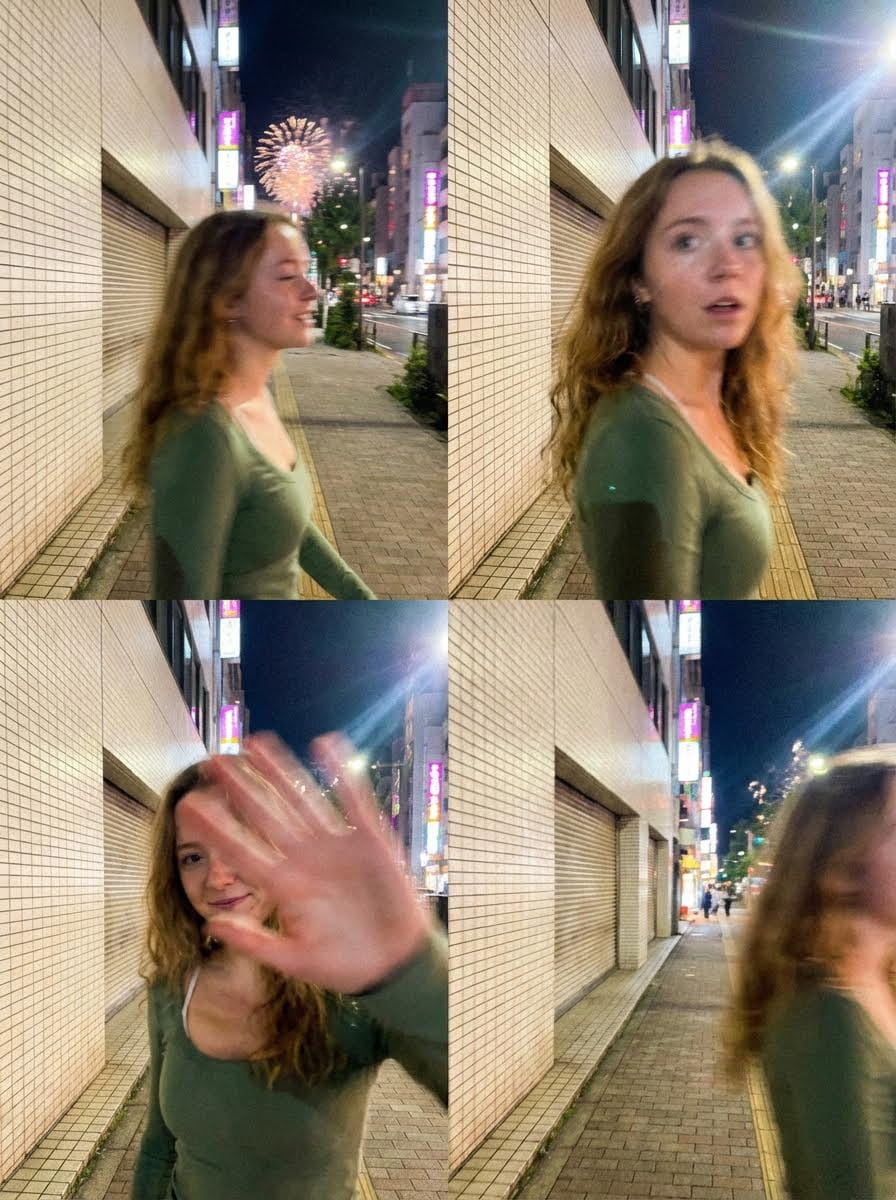 Ultra-realistic failed smartphone burst using uploaded reference image, four vertical 9:16 frames in 2×2 grid, shot during hurried movement. Every frame has technical failure: heavy motion smear, rolling-shutter distortion, missed autofocus, blown flash, digital noise, ghosted double edges. Scene on nighttime Tokyo sidewalk beside off-white tile building during distant fireworks. Smartphone camera shake, autofocus hunting, sensor lag. Frame sequence: walking past unaware, sudden startled head turn with motion blur, reflexive hand blocking lens with shy smile, finally out of frame with extreme blur. Mood: intrusive, awkward, fleeting, like accidental images. Negative: anime, illustration, sharp focus, clean exposure, symmetry, posing, professional camera, filters, glamour.