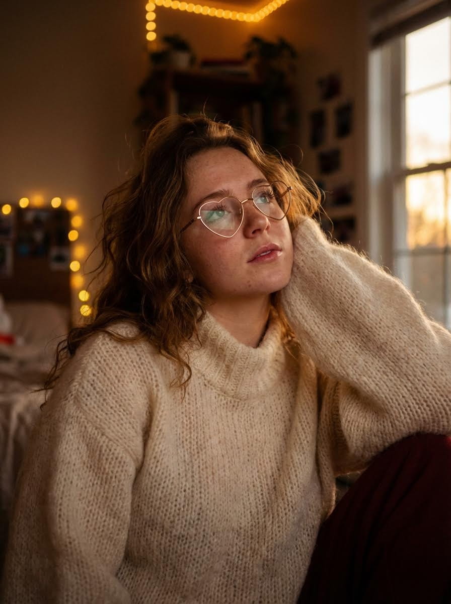 Using uploaded reference image, young woman with voluminous messy textured wavy brunette hair, pensive and dreamy expression with softly parted lips, head tilted back slightly, leaning into high collar of oversized chunky-knit cream mohair sweater, relaxing in dimly lit cozy indoor environment with soft golden bokeh background, gazing upward through gold-framed heart-shaped glasses, illuminated by warm lowkey amber lighting and soft golden-hour glow, medium close-up shot using 50mm f/1.4 prime lens with shallow depth of field and soft-focus roll-off, warm monochromatic color palette of ambers and creams punctuated by vibrant red accents, romantic and nostalgic cinematic film mood, high-fidelity portrait with natural skin texture and subtle film grain, intricate knit patterns and individual hair strands visible, soft light halation and vintage filmic aesthetic, 8k resolution, photorealistic, highly detailed. --ar 3:4 Negative: low quality, deformed, distorted, disfigured, poorly drawn, extra limbs, blurry, motion blur, oversaturated, over-sharpened, digital artifacts, airbrushed, plastic skin, watermark, signature, text, harsh shadows, flat lighting, asymmetric eyes.
