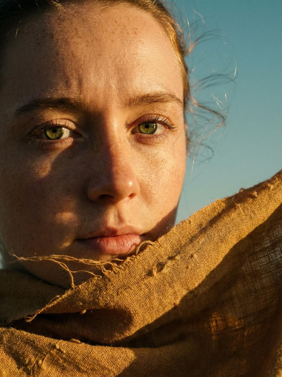 Extreme close-up portrait using uploaded reference image with moss-green eyes emphasized. Shot on 85mm prime lens at f/2.2. Low-angle golden hour sunlight with harsh side-lighting creating cinematic shadows and natural subsurface scattering on skin. Subject wears coarse-weave ochre linen wrap with visible textile fraying and organic pilling, blowing in wind. Hyper-realistic skin texture with visible pores, light freckles, fine flyaway hair backlit by sun. Warm golden skin tones contrasted against desaturated cyan sky, filmic grain, high dynamic range. Cinematic photography. Camera: Arri Alexa LF, Zeiss Supreme Prime lens, 85mm, f/2.2. Golden hour low-angle harsh side-lighting. Color grading: warm golden skin, desaturated cyan sky, filmic grain, high dynamic range. 8k resolution, 2:3 aspect ratio.