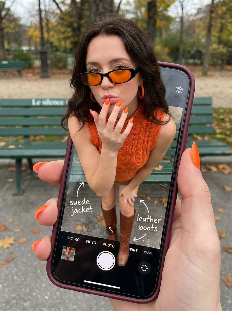 Hyper-realistic optical illusion using uploaded reference image. Young person appears stepping out of smartphone screen held in hand. Screen displays iOS Camera interface with white circular shutter button and 'PHOTO' text, capturing boots on screen while real upper body extends out of phone. Subject in 20s with alluring playful eyes looking at viewer confidently, blowing kiss or pouting with chic expression. Fair smooth skin with natural freckles, light blue eyes, dark brown hair in loose waves with volume. Narrow rectangular black sunglasses with orange-tinted lenses sitting low on nose. Natural eyebrows, minimal makeup. One hand raised with index finger touching lip. Vivid orange manicured nails. Bright orange sleeveless knitted top with visible texture. Bold circular orange hoop earrings. Color coordination between sunglasses, earrings, nails, clothing. On phone screen: White handwritten text overlays with arrows pointing to outfit (e.g., "suede jacket" with arrow, "leather boots" with arrow). Mini skirt and brown leather boots visible on screen beneath UI. POV high angle looking down at hand holding smartphone with burgundy case. Background: Parisian park in autumn with green bench "Le silence" text, grey ground, autumn leaves. DSLR photography, macro lens, composite photography, 3:4 aspect ratio. Sharp screen pixels, fingerprint smudges, realistic fabric. Overcast soft natural light, background bokeh, screen sharp. Negative: transparent screen, blank screen, glass phone, 3d render, cartoon, anime, plastic, drawing, illustration.