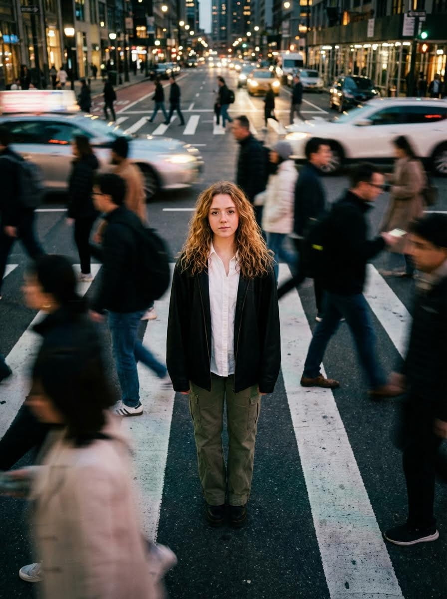 Cinematic street photography using uploaded reference image, moment in motion with crowd blur effect. Overhead portrait of subject standing still on crosswalk, wearing white button-up shirt, black oversized jacket, olive green cargo pants. Motion-blurred crowd rushes past. Moody city lighting, 35mm film aesthetic, shallow depth of field, sharp focus on portrait, artistic timeless style. Preserve exact facial features from reference.