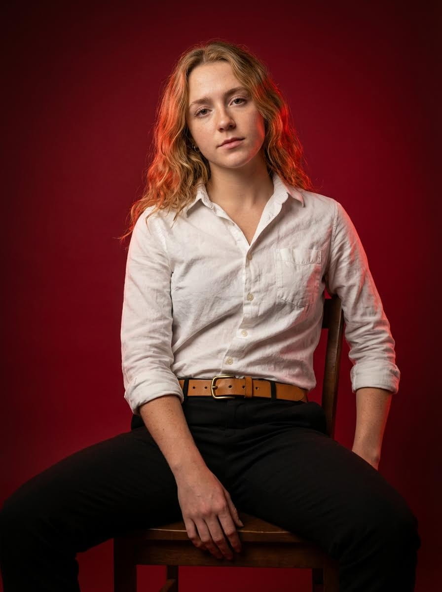 Ultra-realistic 4:5 vertical studio photograph using uploaded reference image, preserving exact facial structure, skin tone, hairstyle, body proportions. Young adult man sits on simple dark wooden chair against deep red studio backdrop with soft radial gradient. Camera positioned slightly low and centered, looking subtly upward. Medium-full body framing, cropped above knees. Relaxed posture, legs spread, hips forward, torso leaning back. Right forearm rests between legs, left arm on chair back. Head upright but subtly tilted, eyes directed toward camera, gaze calm and emotionally neutral. Expression subdued, introspective, quietly intense. White button-up shirt, top buttons undone, collar open. Fabric soft, slightly wrinkled, naturally creased. Sleeves rolled to mid-forearm. Black fitted trousers. Tan leather belt with rectangular brass buckle. Cinematic studio lighting. Strong red rim light from behind creates glowing outline around hair and shoulders. Soft warm frontal key light illuminates face and torso with gentle shadows. Natural skin texture with visible pores. Professional full-frame camera, 50mm lens, shallow depth of field. High contrast moody editorial color grading, ultra-realistic skin and fabric detail, 8K fidelity.Negative: no face alteration, no exaggerated anatomy, no painterly or CGI look, no harsh highlights.