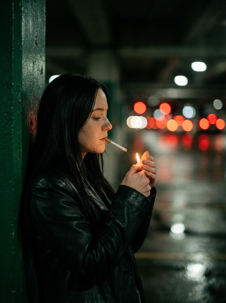 Cinematic side profile using uploaded reference image, young woman with long straight dark hair and calm introspective expression, leaning against dark green textured industrial pillar in dim urban parking garage at night. Cupping hands together to strike lighter with small orange flame providing warm localized glow across face, hands, cigarette. Setting: wet reflective asphalt ground, deep background with soft circular bokeh from distant red and white traffic lights. Medium shot with 50mm f/1.4 prime lens, shallow depth of field sharply isolating subject from blurred environment. Color grade: deep blacks and emerald greens contrasted by warm amber flame light and vibrant red bokeh highlights. Moody noir evoking urban solitude, high-fidelity cinematic film still. Fine details: individual hair strands, subtle sheen of black leather jacket, delicate skin texture under warm point-source lighting. Organic film grain, soft light bloom around flame, professional color timing. --ar 3:4 Negative: distorted hands, extra fingers, blurry face, low resolution, cartoon, 3d render, illustration, watermark, bright daylight, overexposed, messy hair, extra limbs, deformed anatomy.