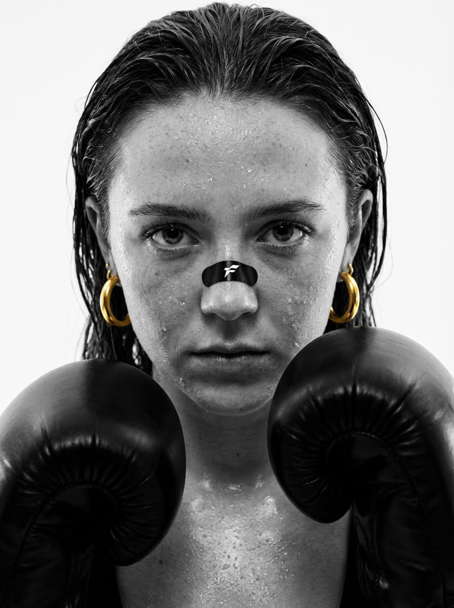 Cinematic close-up using uploaded reference image, 50mm lens, shot on ARRI Alexa LF, center-framed, symmetrical head-on angle. Subject with piercing gaze, wet dark hair slicked back, skin glistening with sweat. Black sports sticker with logo on nose, gold hoop earrings, black boxing gloves raised in fighting stance. Studio with clean white background, smooth, no distractions. Bright directional front light emphasizing sweat, pores, skin texture. Luxury fashion x combat sport aesthetic. Black and white contrast with gold accents. 24fps, clean digital with subtle texture.