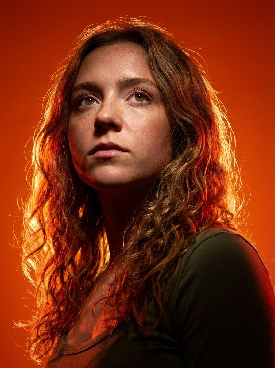 Editorial portrait using the uploaded reference image, photorealistic, intense serious expression gazing upward and beyond camera, shot from low angle looking up for heroic dominance, dramatic studio lighting, chiaroscuro effect with deep shadows, vibrant orange and deep red color palette, strong rim light creating a halo, solid orange-red smooth gradient background, hot atmosphere, sharp focus on face, natural skin texture, 8k resolution, cinematic lighting. Preserve exact facial features, skin tone, hairstyle from reference image.