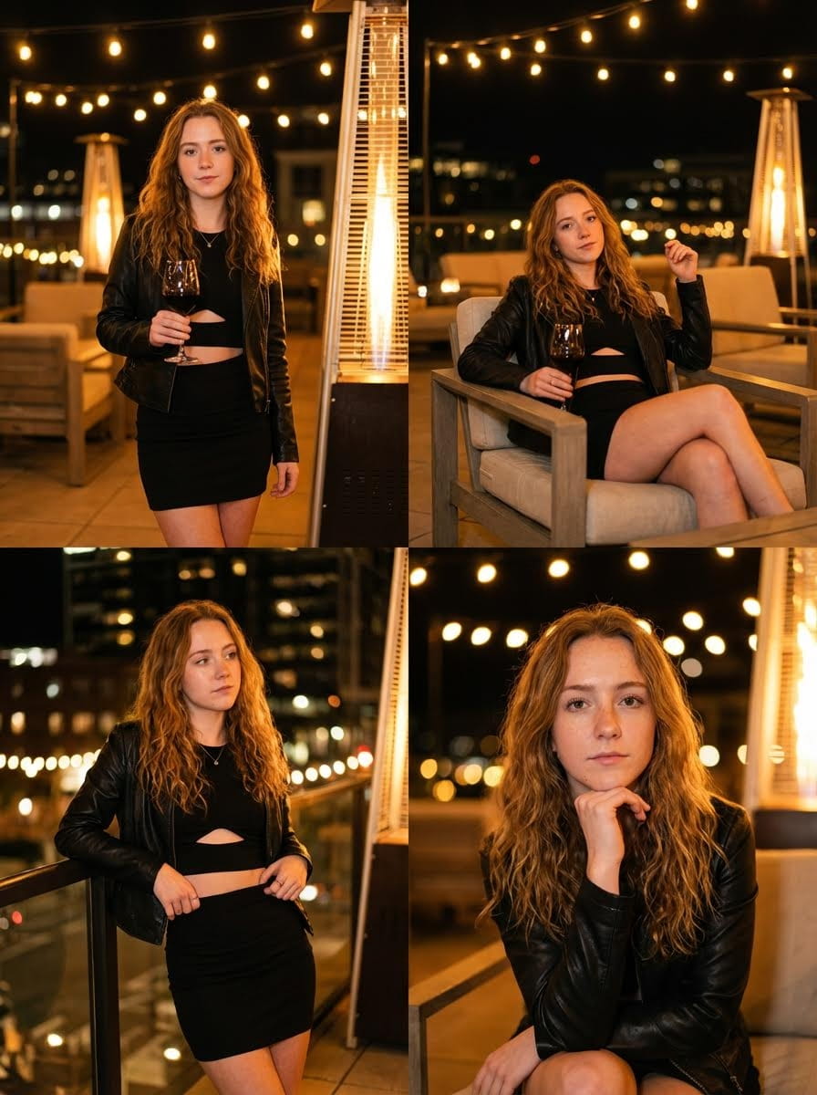 Four-image collage using uploaded reference image, 2x2 grid format, nightlife lifestyle scene. Outdoor restaurant lounge patio at night, urban intimate upscale environment. Warm ambient lighting from patio heaters and string lights. Same subject, outfit, location across all frames. Long hair loose and softly waved. Black leather jacket, black cut-out crop top, black fitted mini skirt. Four expressions and poses: standing with wine glass (confident), seated holding wine glass (relaxed), leaning with hands near waist (contemplative), resting chin on hand (posed). Red wine glass visible, tall outdoor gas patio heater emitting warm light in background. Professional nightlife photography, shallow depth of field, cinematic color grading, warm tones, bokeh lights.