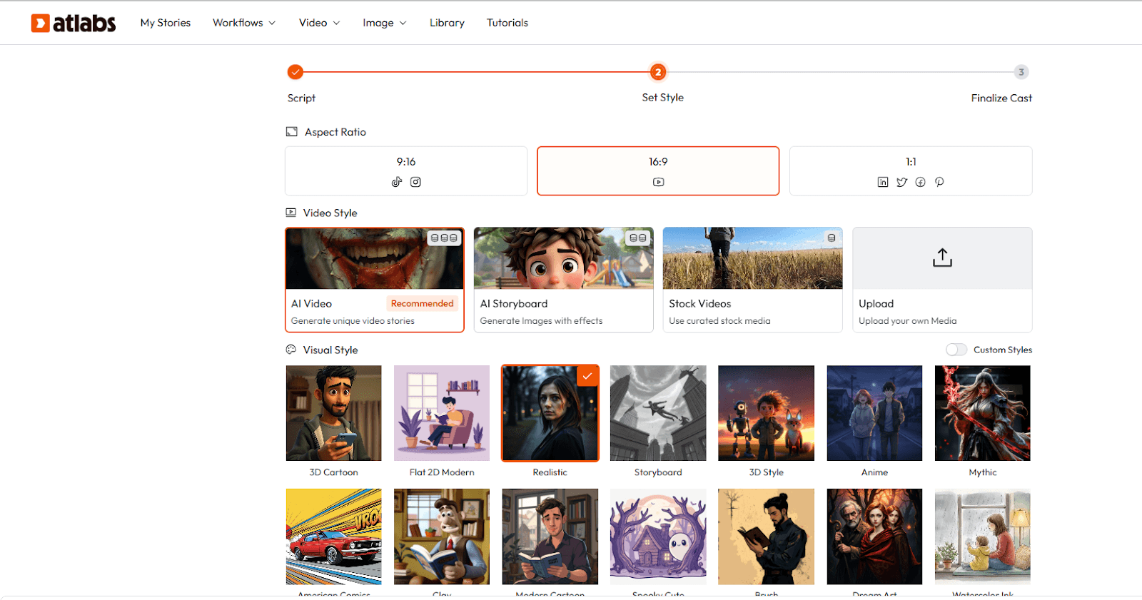 Atlabs gives you 50+ visual styles to choose from. For faceless channels, the most effective ones are: