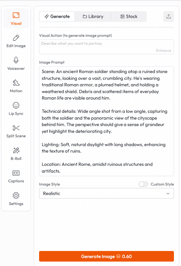 AI-generated visuals: Every scene is rendered to match the narration content and the visual style you selected. Scenes change as the topic progresses, wide establishing shots, close-up details, motion sequences, all auto-matched to the script.