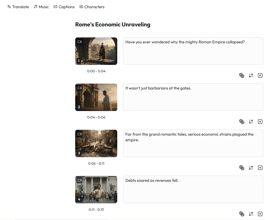 "A 5-minute video explaining why the Roman Empire actually collapsed, not the popular version, the real economic and military reasons. Serious documentary tone, dramatic pacing, aimed at history enthusiasts aged 25-45."