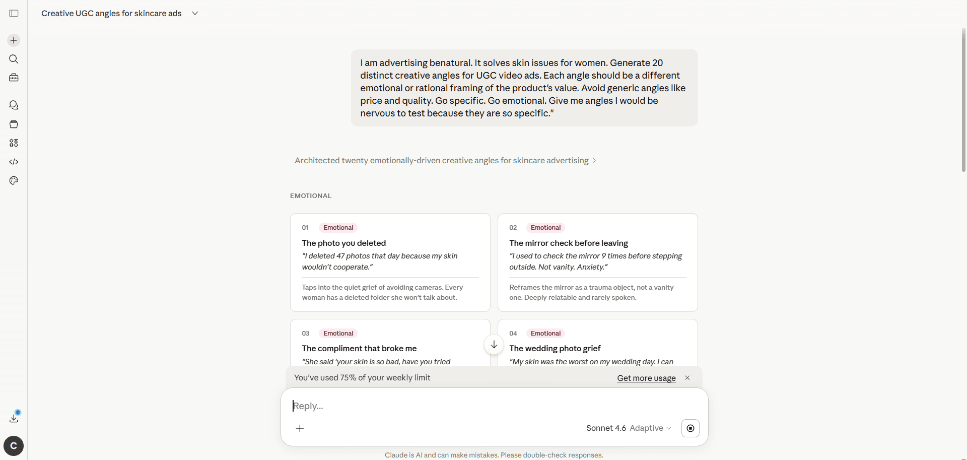 1 | Map Your Creative Angles (Target: 20 Angles) The angle is the specific framing of your product's value. Not the script, not the hook. The underlying strategic reason why a viewer should care. A product can have dozens of legitimate angles. Most brands test two or three. The 50-ad system starts by finding all of them. Claude Prompt (copy and use):