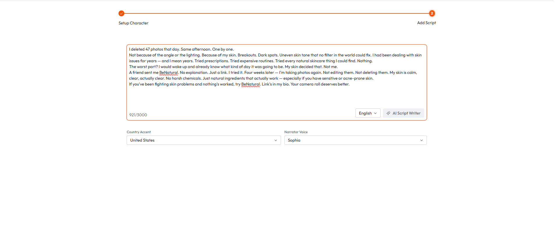 Ask Claude to write two scripts per angle using this structure. Total script length: 70 words maximum. Short scripts produce short audio tracks, which reduce character drift in the video generation and force message clarity. |