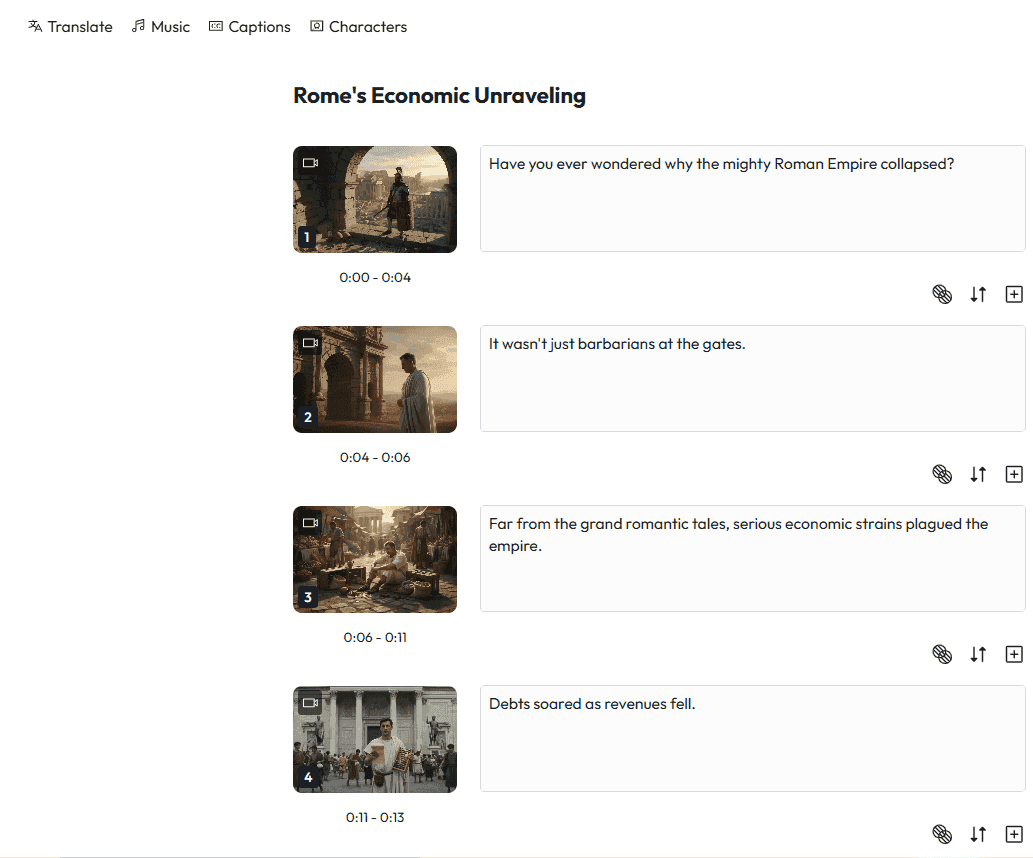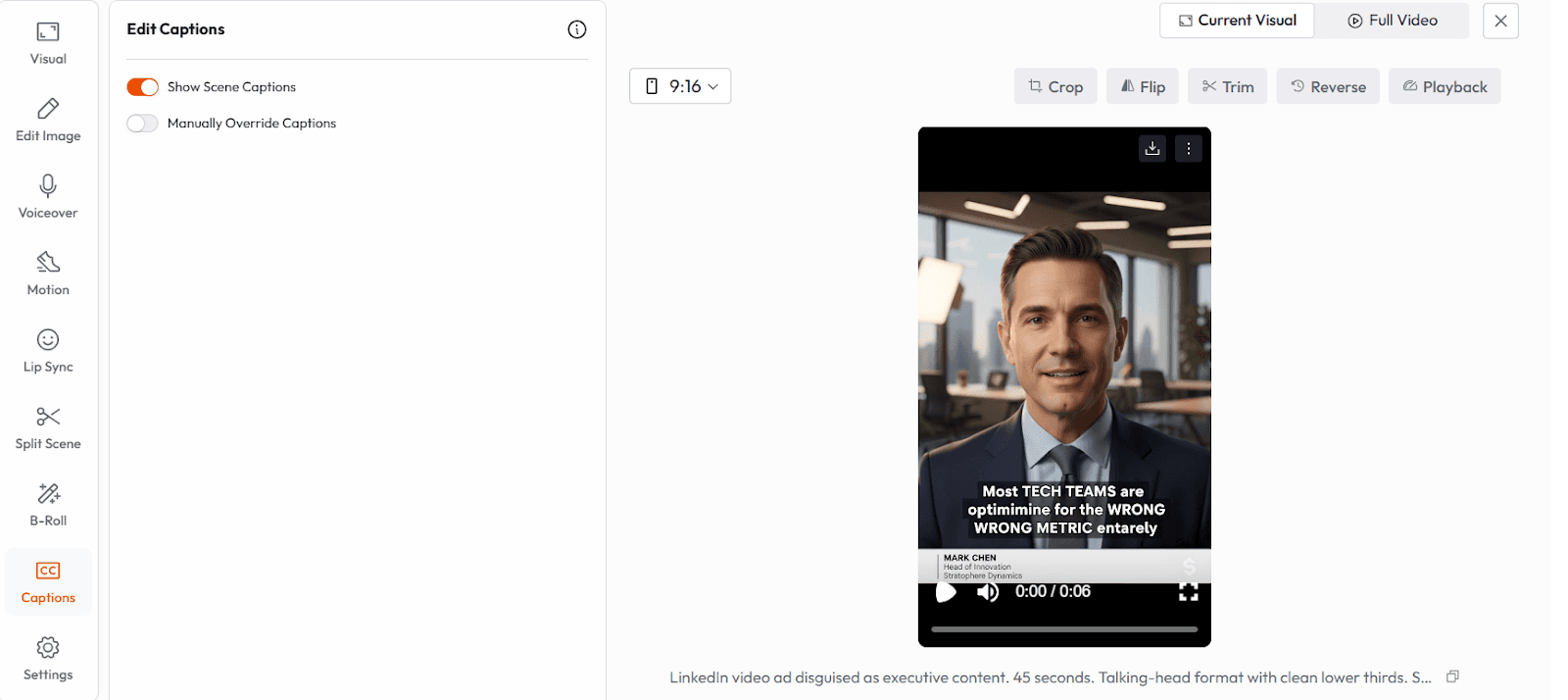 Captions: Atlabs generates auto-captions from your script with styling options. For social media content, bold animated captions increase completion rates significantly. For corporate or educational content, clean sans-serif subtitles at the bottom of frame are standard.