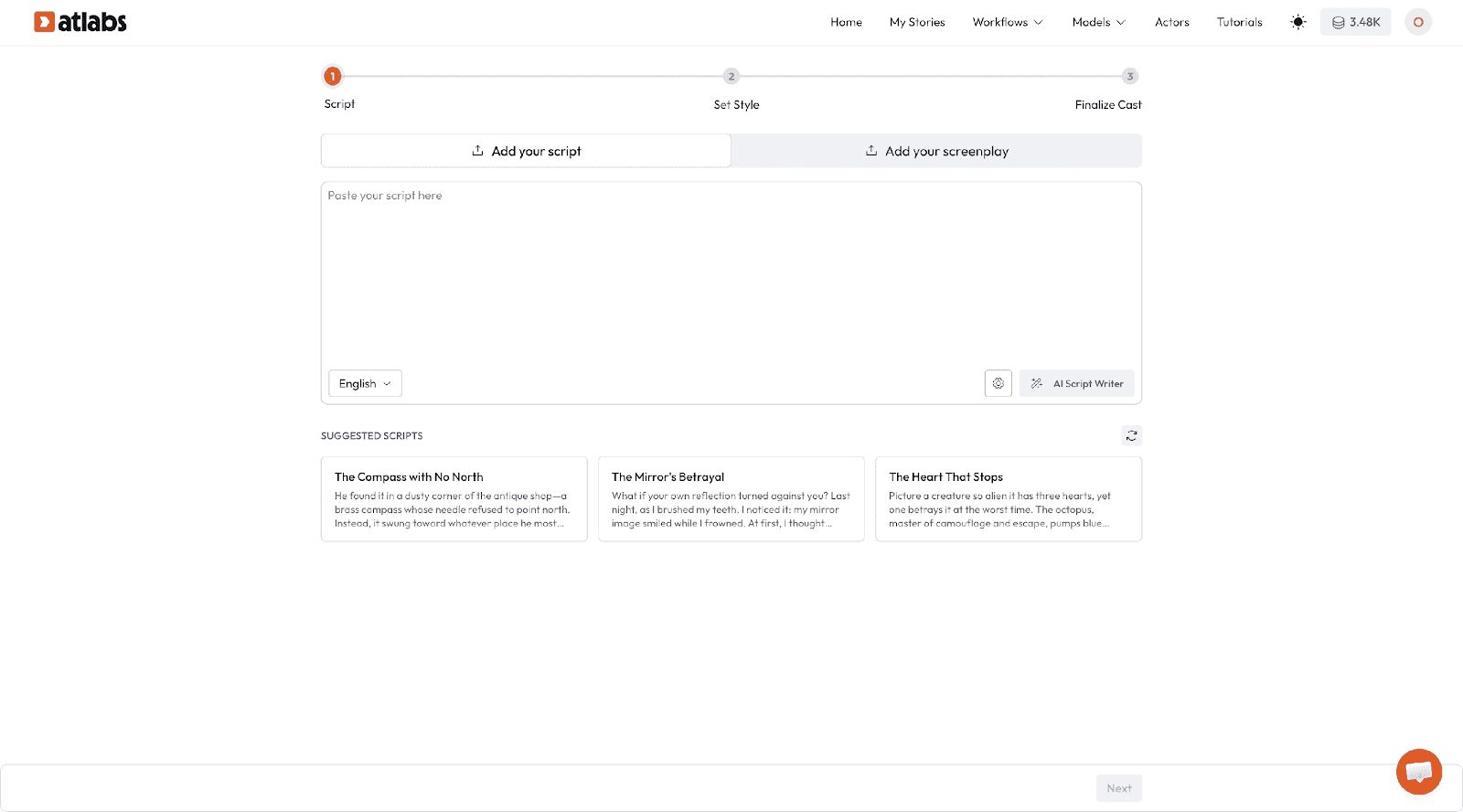 Open Atlabs and start a new project. Paste your script directly into the script editor, or use the built-in AI Script Writer to generate one from a topic or brief.