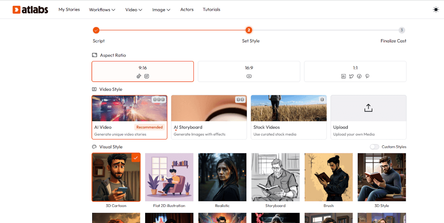Atlabs offers more than 50 visual styles and the option to generate a custom background from a text prompt. For beginner-friendly production: