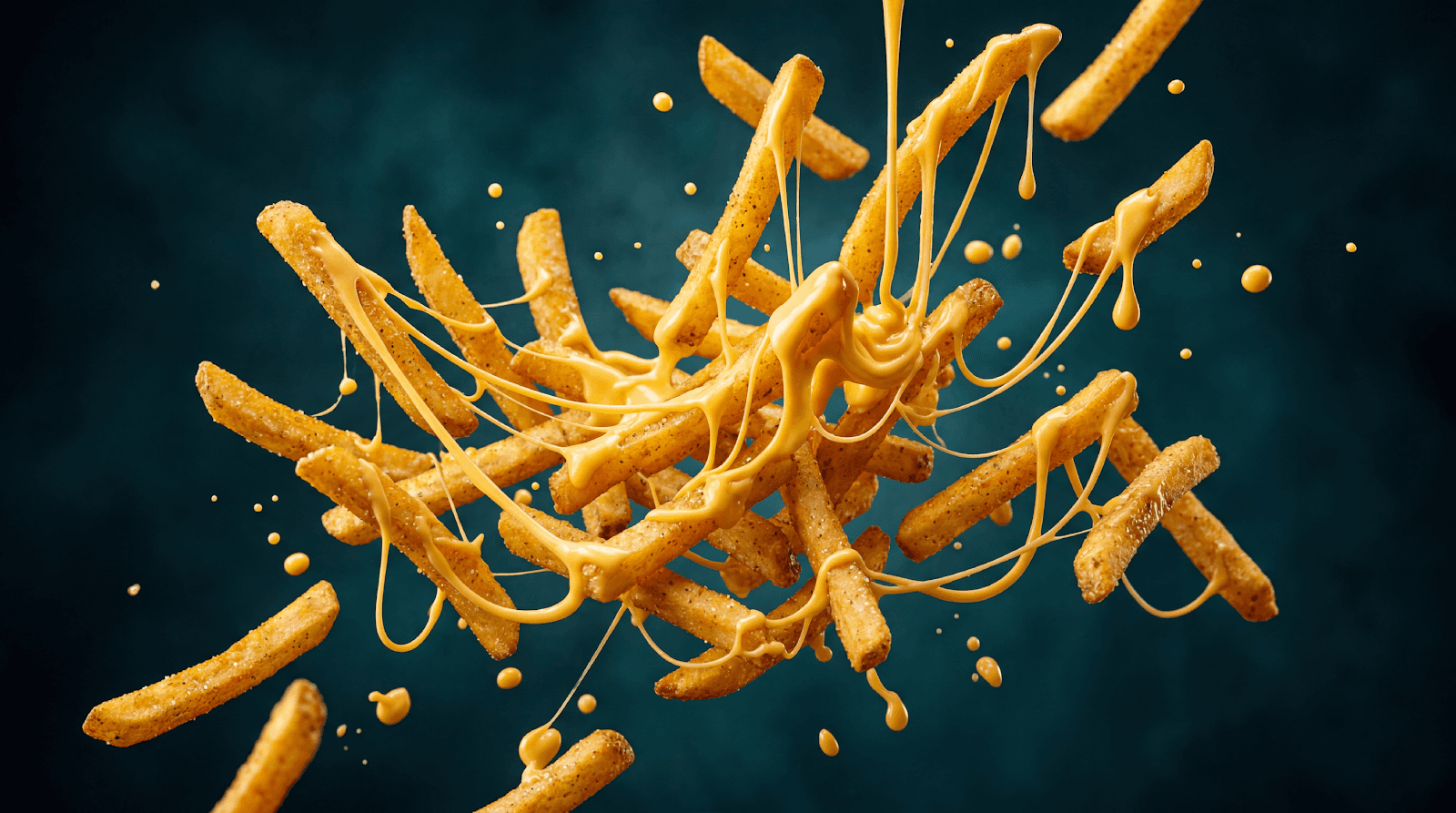 Medium close-up on 50mm lens. The cheesy fries settle into perfect hero composition, cheese strings still gently swaying, steam drifting upward. Fries perfectly centered, cheese glistening like liquid gold. Subtle slow rotation, crisp focus, glossy reflections, premium fast food commercial finish. Deep teal gradient background, studio rim lighting. 4K, ultra sharp detail, rich saturated color, smooth slow motion, stable picture.