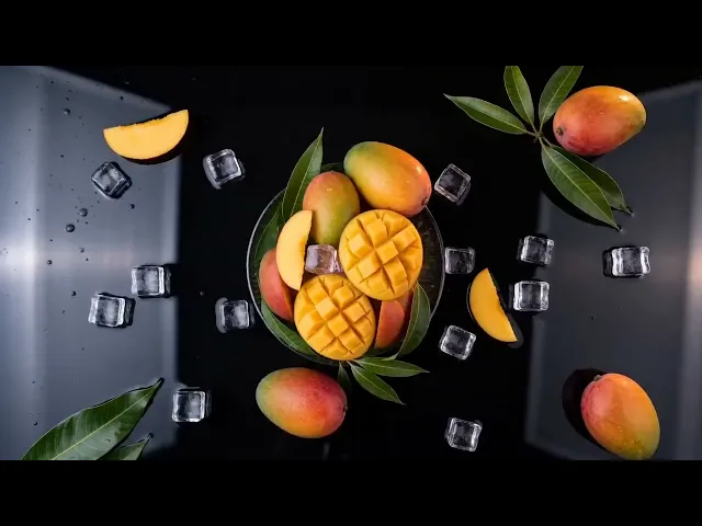 @Image1 as the hero product reference throughout. Vivid tropical orange, golden yellow, and deep dark backgrounds. High-energy food commercial aesthetic, 24fps, cinematic depth of field. 0 to 4s: Hero establishing shot. The @Image1 can stands centered on a dark wet reflective surface, surrounded by fresh mango leaf sprigs, two chunky ice cubes, and two thick mango wedge slices. Deep amber-orange backlight creates a warm halo around the can. Water droplets on the can surface catch the light. Camera on a slow push-in from a slight low angle, revealing the label text and illustration. 4 to 8s: Cut to a dramatic macro close-up. A fresh ripe mango is sliced in half in slow motion on a wooden board. The blade passes cleanly through, revealing the vivid orange interior flesh in full frame. Tiny juice droplets spray outward catching studio backlighting. Camera pulls slightly back as the two halves separate and fall open. Golden floating particles drift across a dark warm background. 8 to 12s: Full overhead locked-off bird's-eye shot. The @Image1 can sits at center. Whole mangoes, scored mango halves, ice cubes, mango leaf sprigs, and golden juice splashes are arranged around it in a circular explosion pattern radiating outward from the can. Camera slowly cranes back as more elements drift outward. Bright overhead studio light, dark reflective surface, droplets and splash details crisp. 12 to 15s: Camera returns to a low front-angle hero shot of the @Image1 can. Ice cubes and mango wedges settle into place around it. A single large droplet runs slowly down the can surface. Camera holds. Warm amber glow. Clean fade to black. Audio: Knife slice impact at 4s, soft tropical ambient music building through the overhead explosion shot, single clean beat hit on the fade.