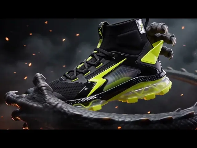 @Image1 as the hero product reference throughout. Deep charcoal, matte black, and electric neon yellow-green color palette throughout. High-end sneaker commercial aesthetic, dramatic low-key studio lighting, 24fps cinematic, film grain. 0 to 3s: Clean studio hero shot. The @Image1 sneaker is placed side-profile on a minimal dark surface, single strong directional key light from the left carving out every surface texture. Matte black mesh upper, neon yellow lightning bolt detailing along the lateral side, and transparent air-cushion outsole all sharply defined. Camera on a very slow orbital push-in from right to left. No other elements in frame. Complete silence then a low subsonic rumble begins. 3 to 7s: Atmosphere shift. Environment darkens. Glowing neon yellow energy begins emanating from the outsole of the @Image1 sneaker, pulsing outward in slow waves. A massive reptilian creature claw enters frame from the left in extreme close-up, scaled and dark, wrapping its talons slowly around the sneaker. The shoe glows brighter at the touch. Camera cuts to an extreme close-up of the neon lightning bolt detailing, the creature's claw tip resting against it. Ember-like sparks drift upward in the background. 7 to 12s: The @Image1 sneaker is lifted upward by the creature, held aloft. Camera at a dramatic low angle looking up as the shoe rises against a smoky dark background, rim-lit by the neon yellow glow. The creature's scaled arm and claw visible at the base of frame. Camera orbits 90 degrees slowly around the elevated shoe. Glowing neon outline around the full sole and toe-box. 12 to 15s: The sneaker is set down on a dark stone surface. Camera pulls back to a wide low-angle shot. The creature has withdrawn. The @Image1 sneaker sits alone, the neon yellow glow fading slowly to a subtle pulse. Embers drift. Single overhead rim light. Camera holds. Fade to black. Audio: Deep subsonic rumble building from 3s, creature ambience, neon hum resonance, single heavy impact sound on the final frame.
