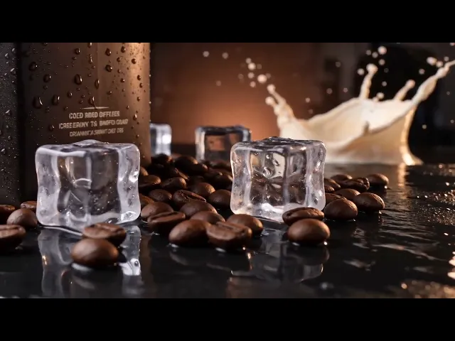 @Image1 as the hero product reference throughout. Deep espresso browns, warm amber tones, and dark glossy blacks throughout. Premium coffee commercial aesthetic, 24fps cinematic, shallow depth of field. 0 to 4s: Hero establishing shot. The @Image1 carton stands on a dark reflective stone surface in a dim, moody bar or kitchen environment. Warm amber backlight from behind creates a subtle glow around the edges of the packaging. Two clear ice cubes and a scattering of whole roasted coffee beans are arranged at the base. A single cream splash is frozen mid-air to the right of the carton, catching backlight. Camera on a slow low-angle push-in toward the label. 4 to 8s: Camera cuts to an extreme close-up macro. A thick, glossy stream of cold brew liquid pours in slow motion from the top of the frame, landing in a glass below. The pour is silky and opaque, rich brown, catching warm side-lighting that reveals the liquid's depth and texture. A thread of cream enters from the right side and spirals into the coffee stream in slow motion. Camera holds locked off on this pouring action, a slow tilt downward following the stream. 8 to 12s: Camera pulls back to a medium close-up of the prepared glass. Dark cold brew over ice cubes, cream swirling in slow motion through the liquid in a marble pattern, the glass beaded with condensation. The @Image1 carton is partially visible out of focus in the background. Camera on a subtle slow lateral slide right to left. 12 to 15s: Return to full product hero shot. The @Image1 carton centered, ice cubes and coffee beans framing it, the cream splash still suspended mid-air to the right. Camera slow push-in to label. Warm amber highlight scanning across the carton surface from left to right. Fade to black. Audio: Ice clink at 0s, deep ambient coffee shop hum, soft liquid pour sound from 4s, fade to silence at 13s.