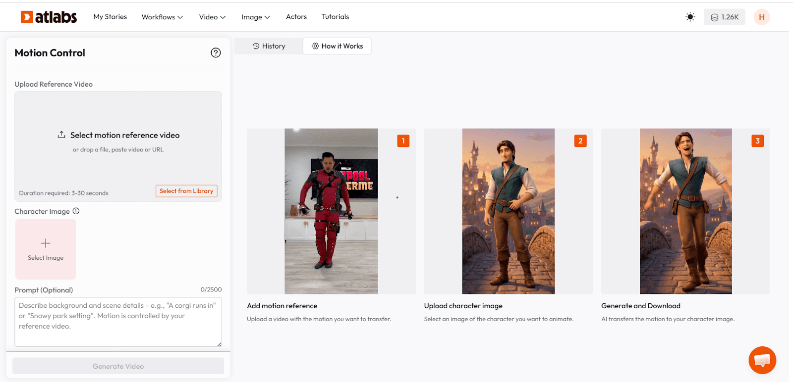 Atlabs simplifies this workflow through its Motion Control feature inside the dashboard.