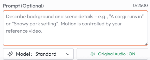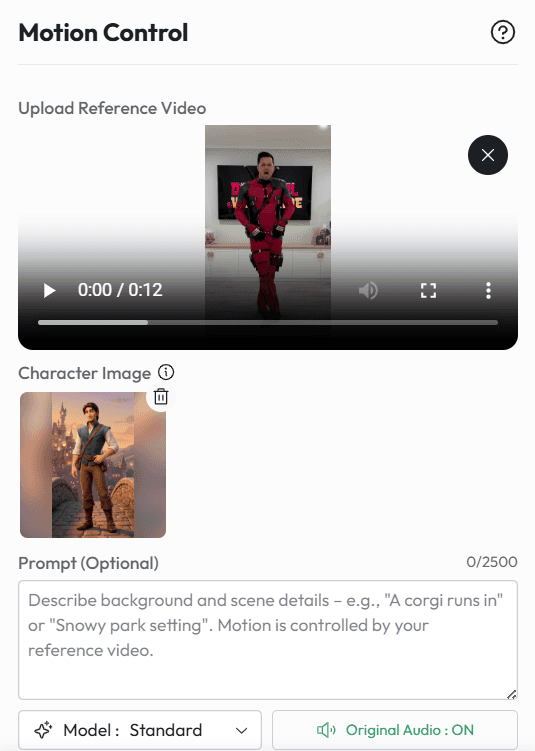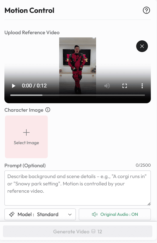 Creators can open the Motion Control tab and generate videos by combining a character image with a motion reference.