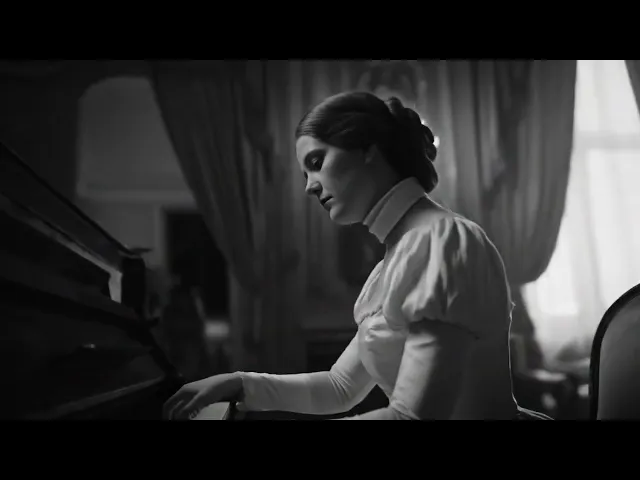 Example: Slow dolly-in, black-and-white vintage film look with soft focus and film grain. A young woman in a flowing Edwardian dress plays a grand piano in a lavish 1900s drawing room. Camera moves from her gliding fingers to a close-up of her emotive face lit by flickering candelabra. Velvet drapes, gilded furniture, and chandeliers drift into view with ornate shadows and a soft breeze moving sheer curtains. Melancholic Chopin-style nocturne plays on solo piano, recorded like an antique phonograph warm mono tone, with faint crackle, floor creaks, and distant ticking clock.