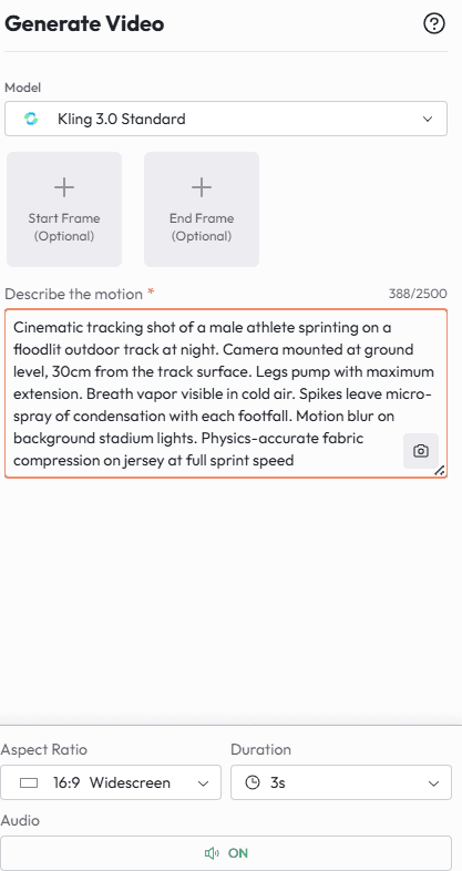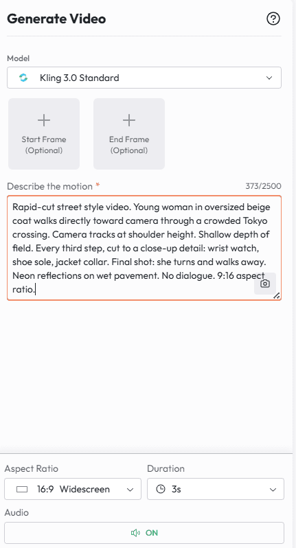 Kling 3.0 works well from text prompts and a Motion Brush feature that lets you paint motion paths onto a source image. It does not require reference files, which makes it significantly faster to start but less precise when adherence to a specific visual identity is critical.