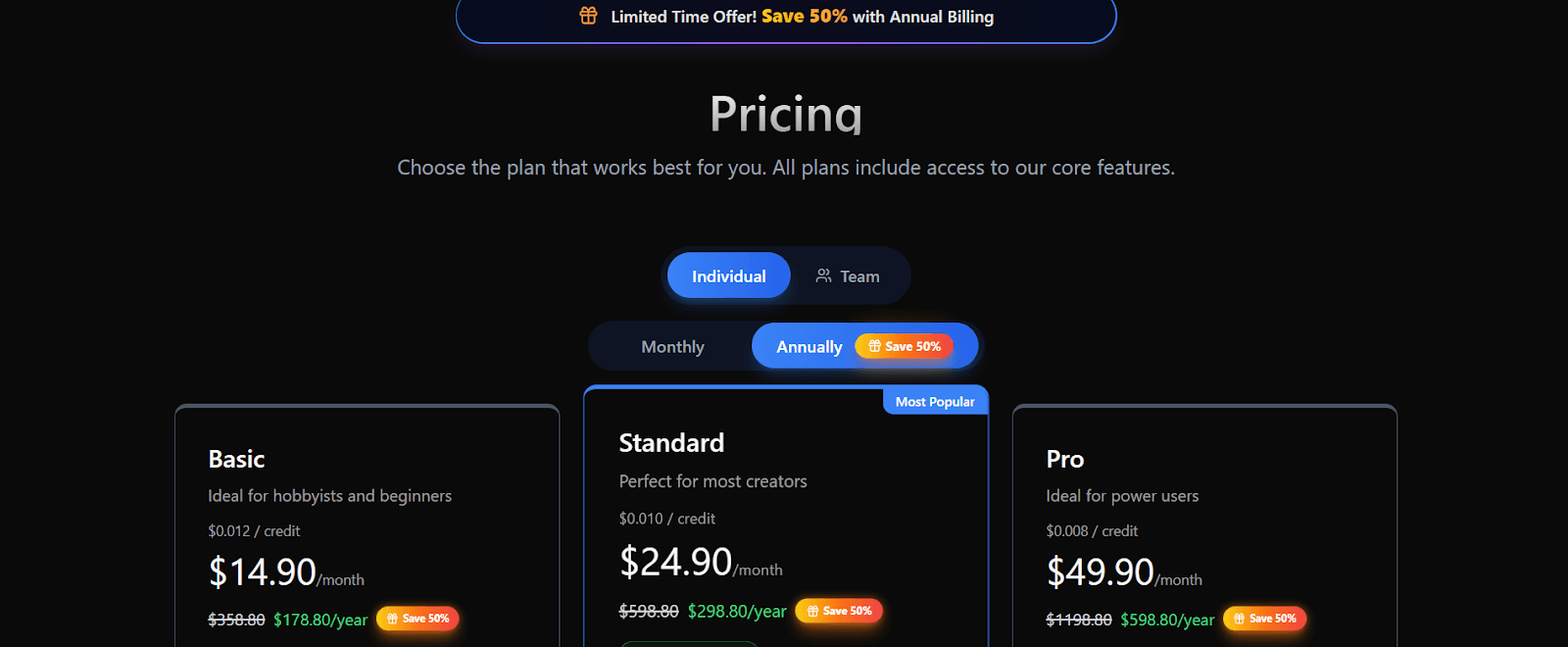 Seedance 2.0 starts at $19.90 per month on its standard plan, with a generous free tier that includes daily bonus credits for new users. If your workflow involves multimodal reference inputs and longer generation pipelines, the per-output value of Seedance improves at mid-to-high usage tiers.