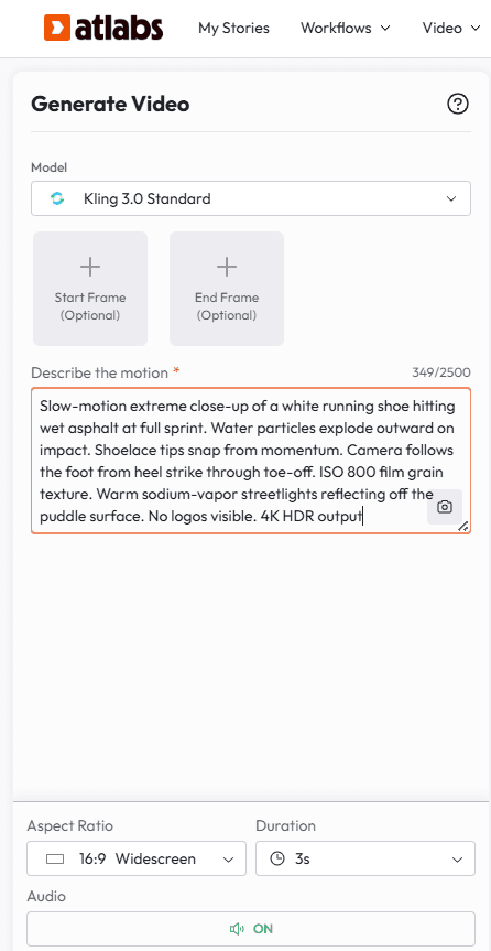 Copy these directly into Atlabs. Each prompt is scoped to a use case where Kling's motion physics and speed give it the clearest advantage.