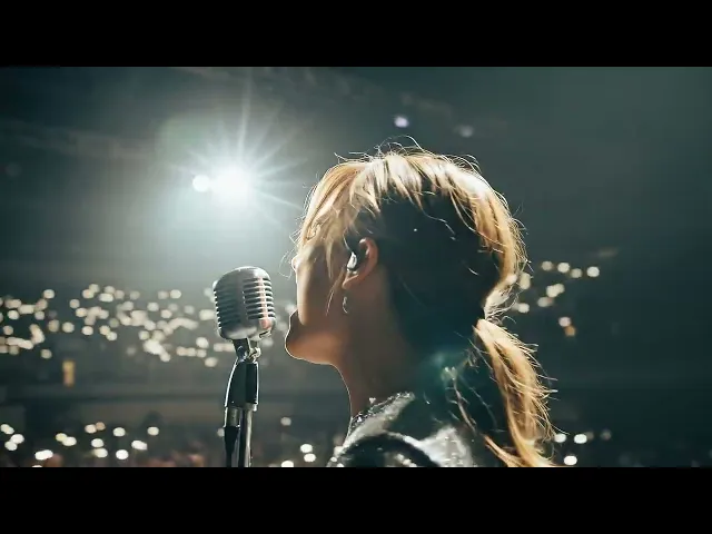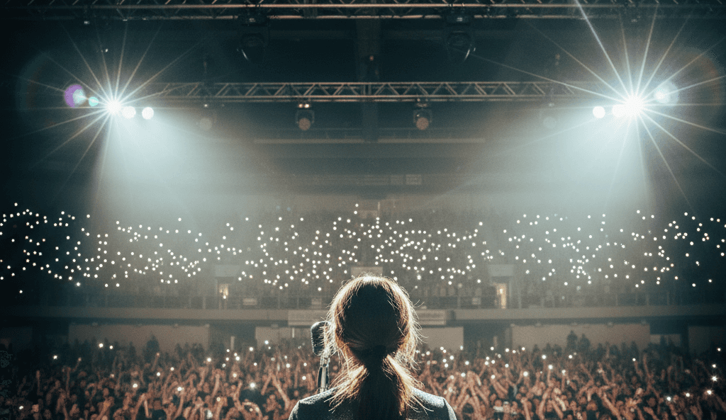 Slow crane motion rising from the singer’s face to reveal the audience as music swells. Audio: the crowd erupts in applause, live performance ambience.