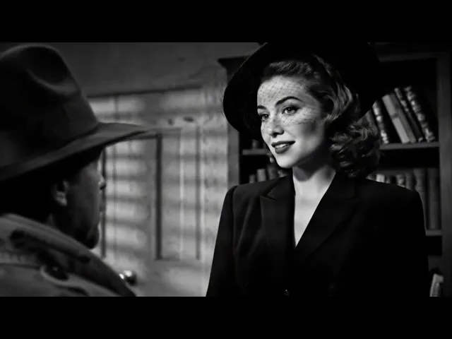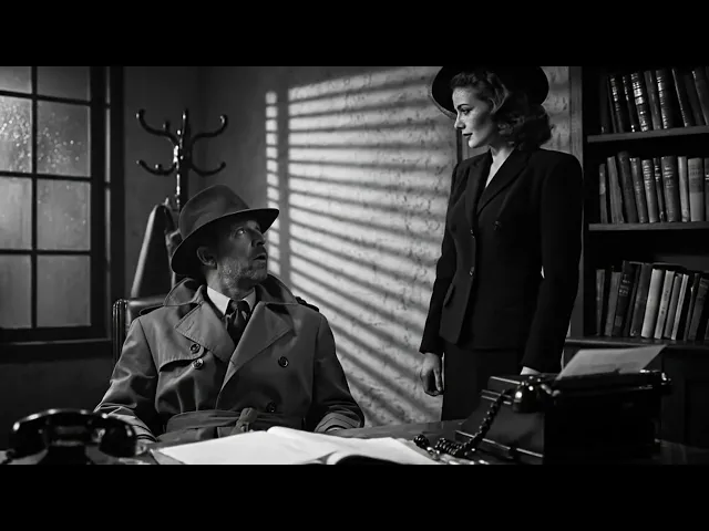 Setting: Old detective’s office with wooden blinds, desk lamp glow, cigarette smoke haze.